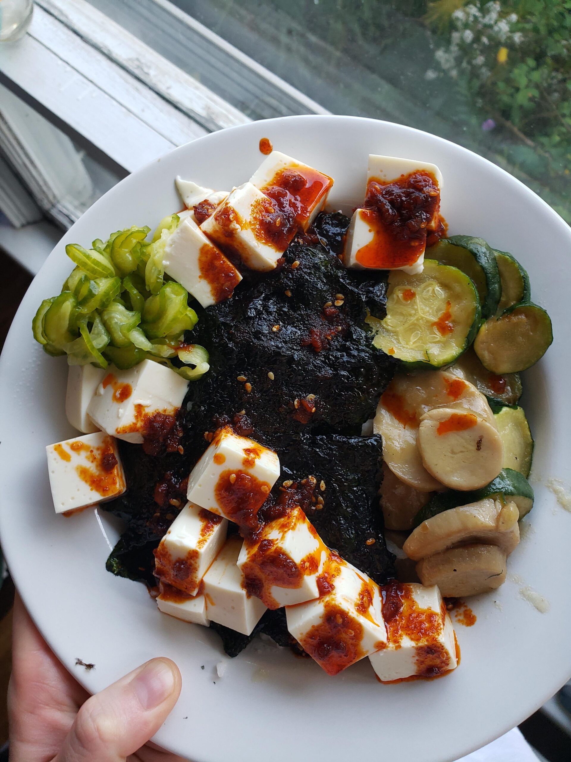 Sticky rice covered in nori seaweed, raw soft tofu, zucchini & king oyster mushies, cucumber salad, and chili miso oil / condiment by granulesofsand Dining and Cooking