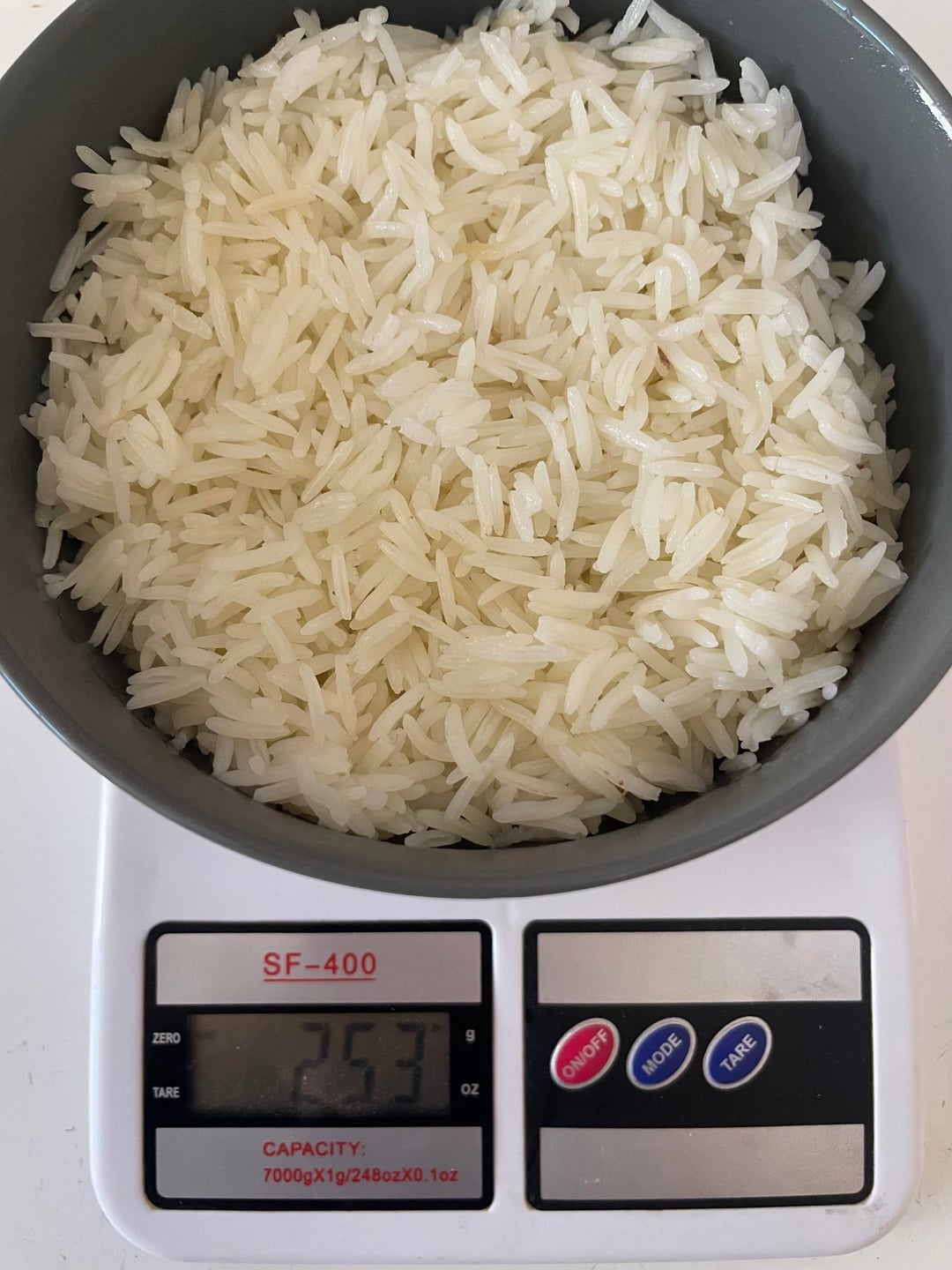 Basmati rice would be about 330 calories. If it’s homemade chicken broth it could be a bit higher.