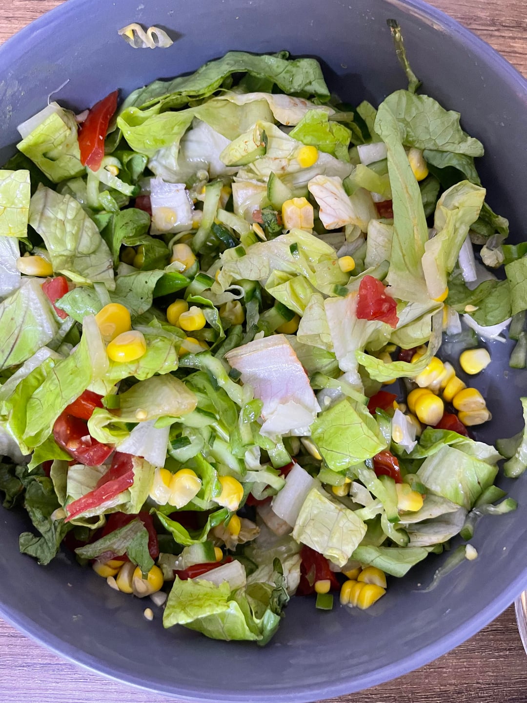 salad, like 5 spoonfuls? it’s made with lettuce, tomatoes, cucumbers, sweet corn, bell peppers, lemon juice, and a bit of dried cilantro.