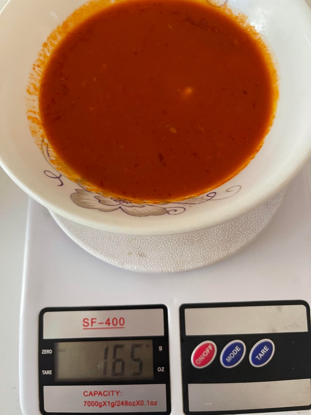 okra stew but the weight is without okra, and multiple garlic cloves. the stew base is made of tomato and tomato paste, also has oil. it’s 165g but i only had 47g.