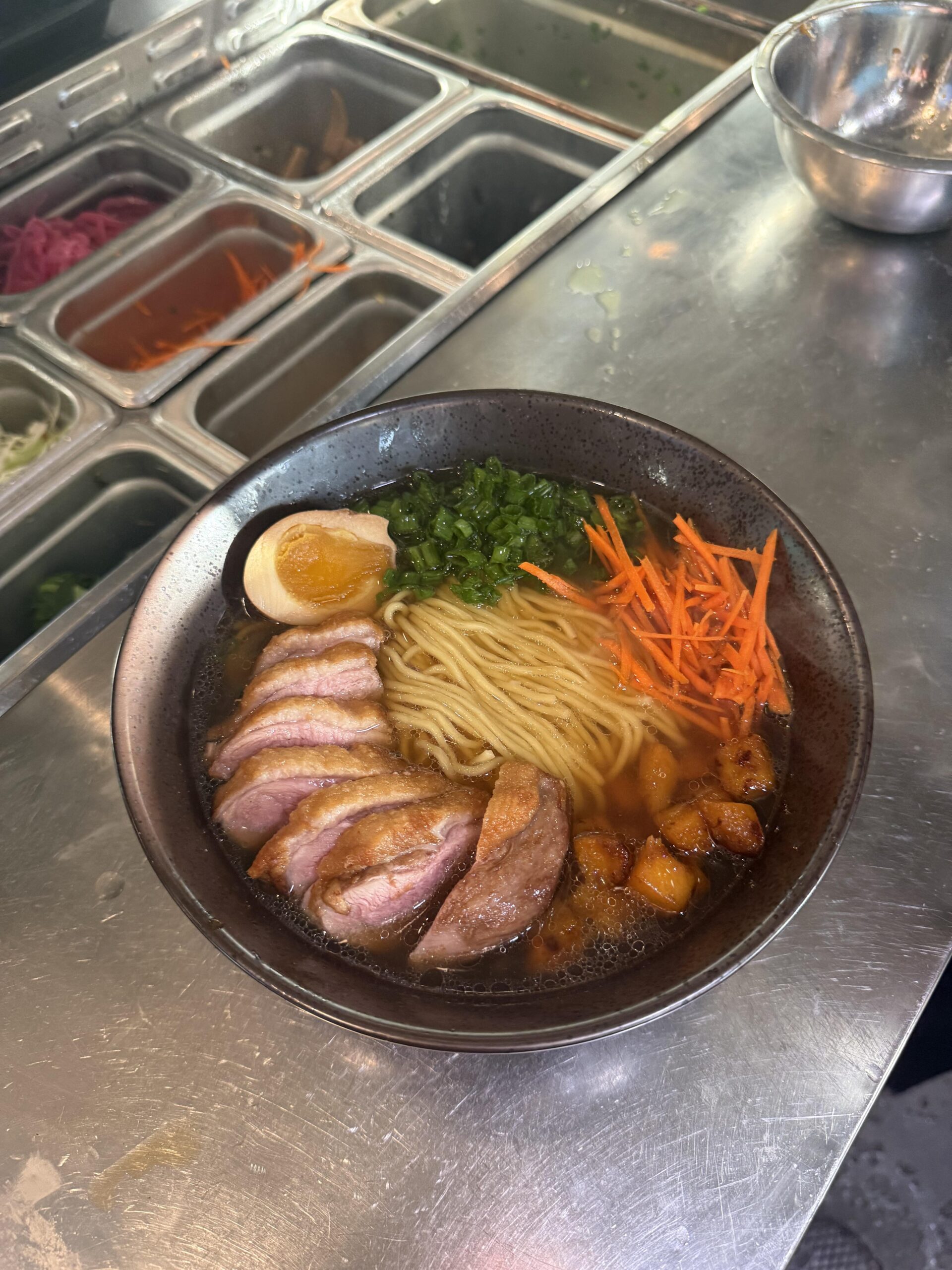 Duck breast, carrots, green onion, crispy butternut squash, chicken chintan, shoyu, duck fat..by here____now Dining and Cooking