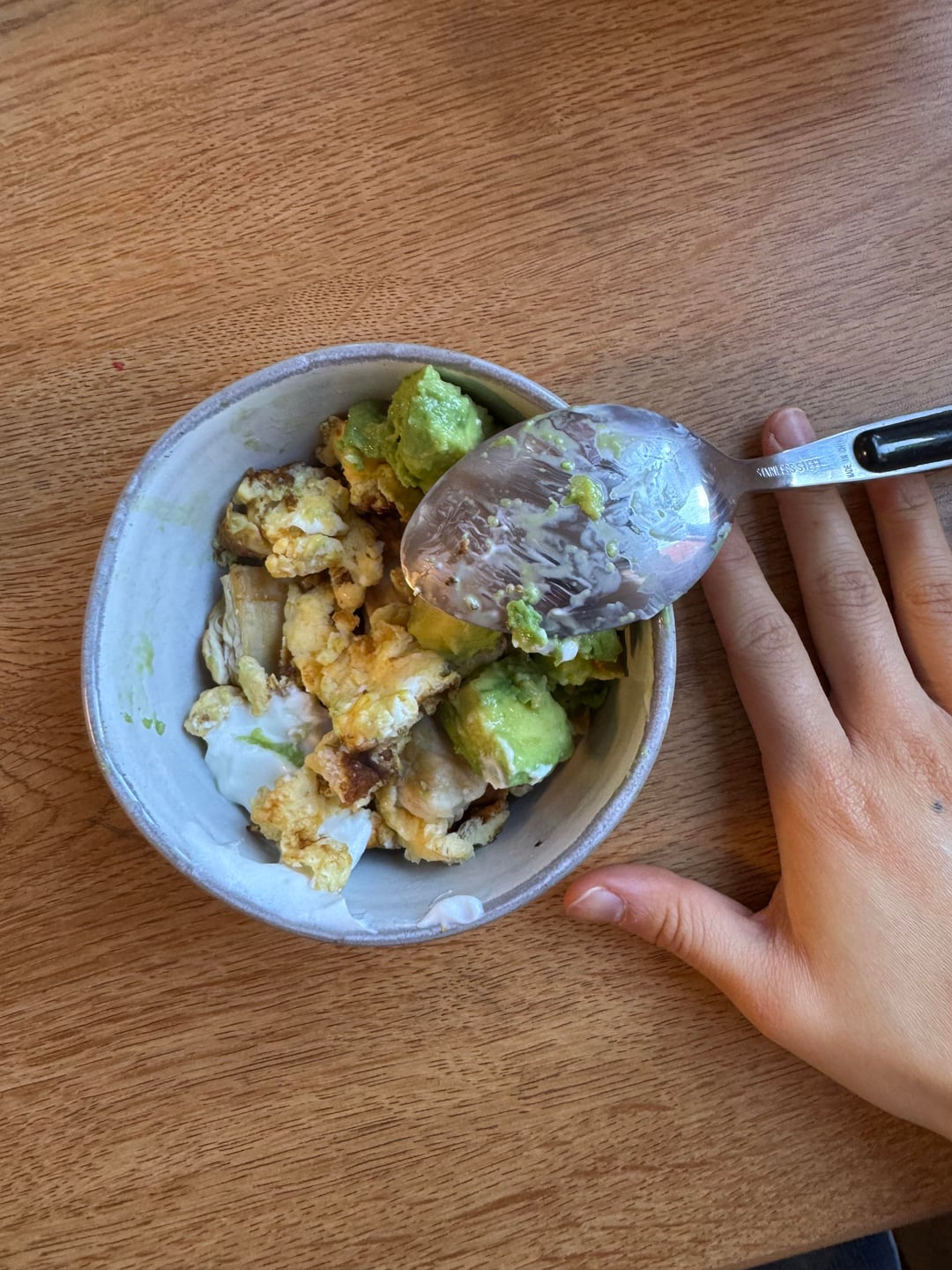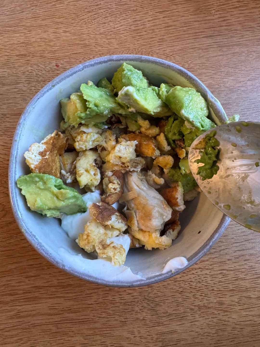 2 pieces of chicken breast, half a medium avocado, dollop of plain Greek yogurt, 1 scrambled egg, no oil!