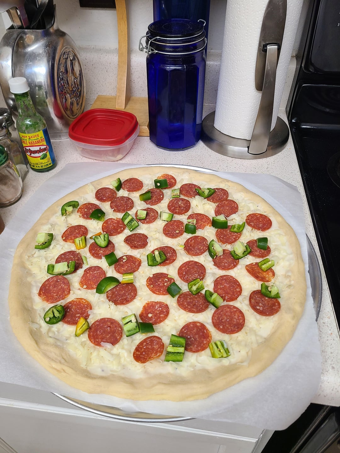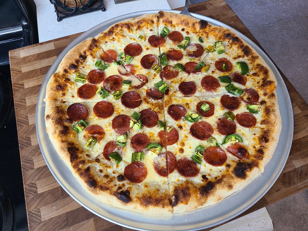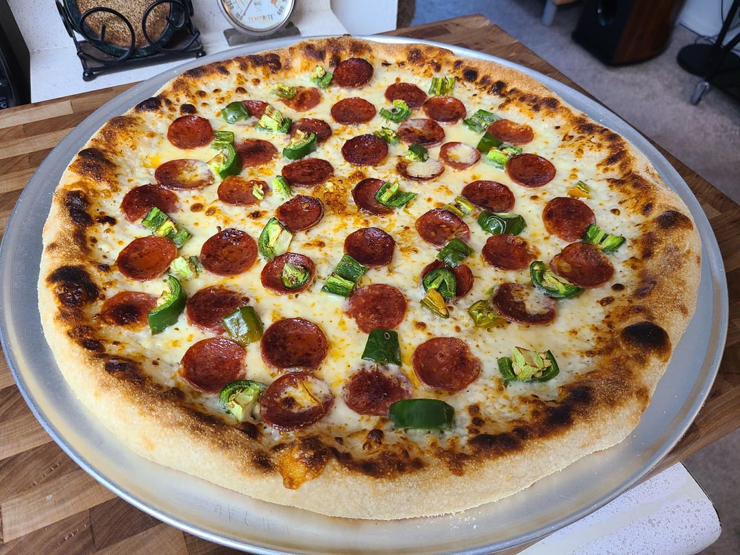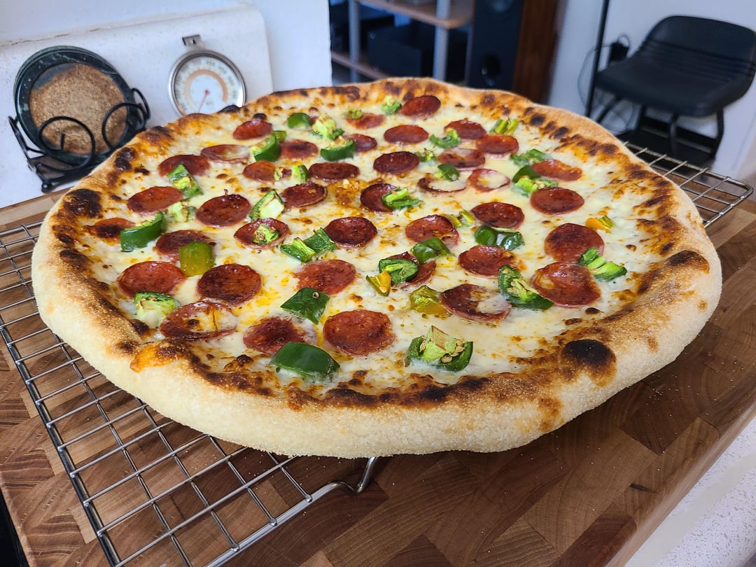 Hand-sliced pepperoni, jalapeños and serranos peppers, (my own) garlic white sauce, fresh shredded mozz and provolone!