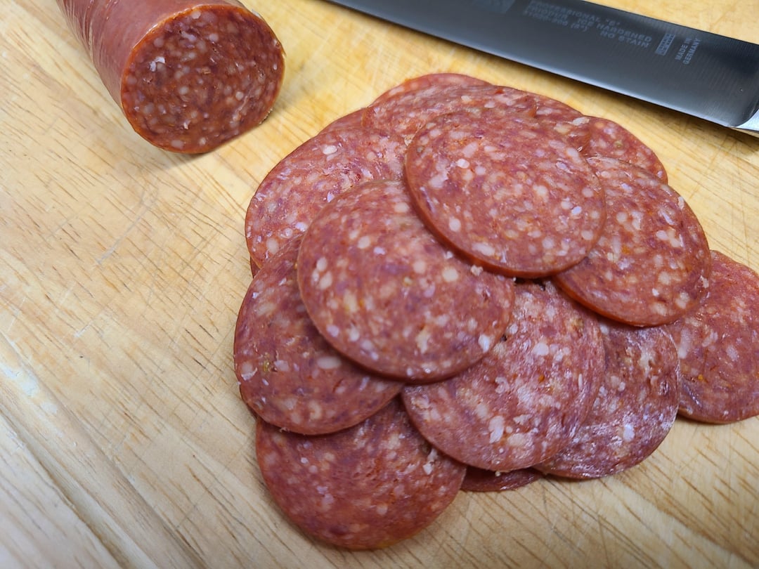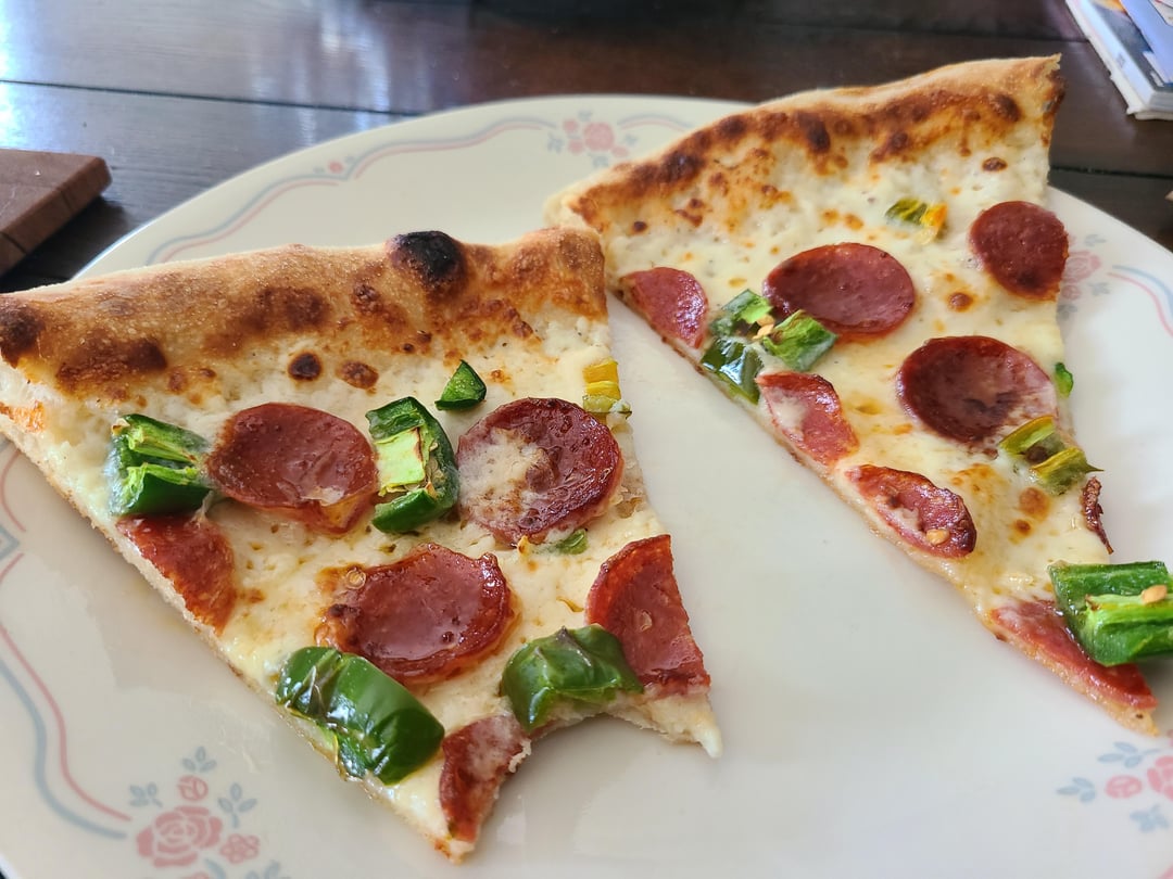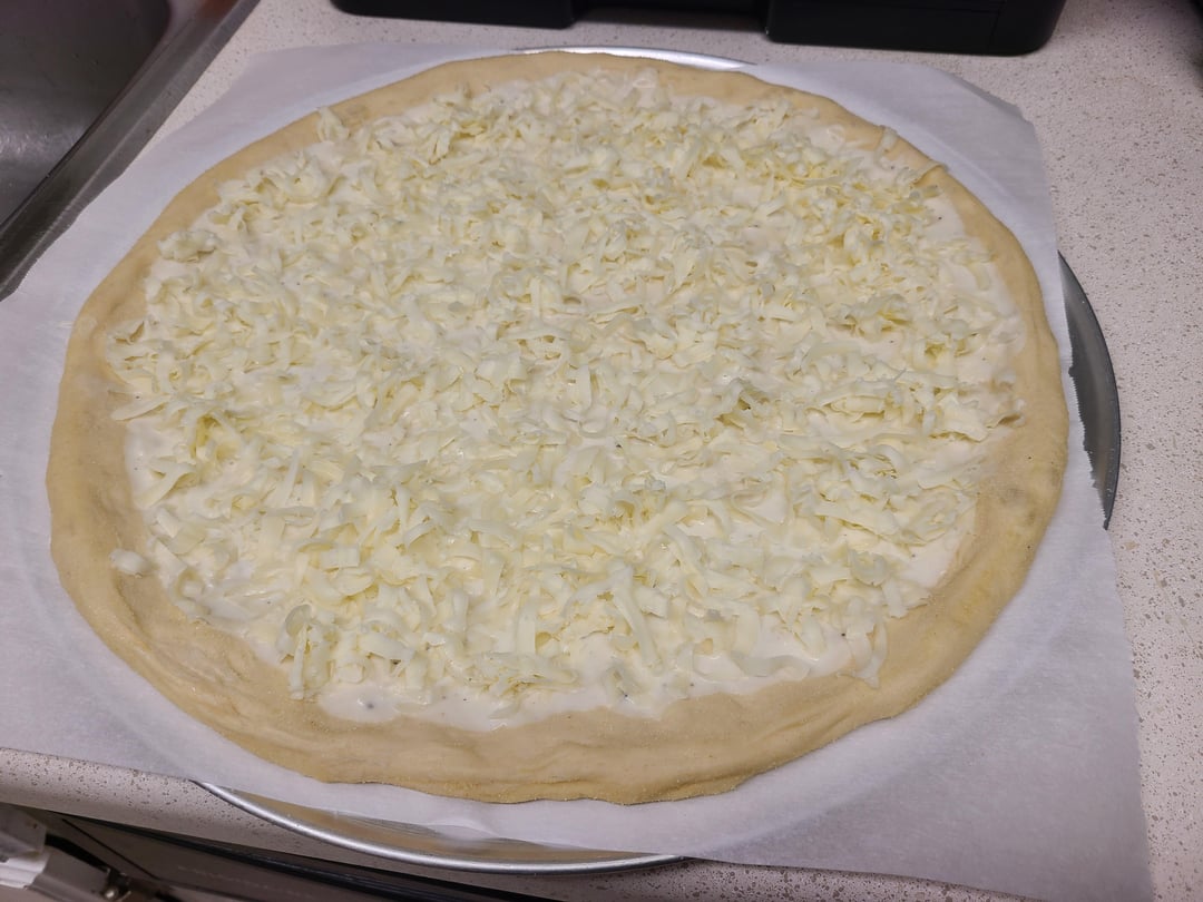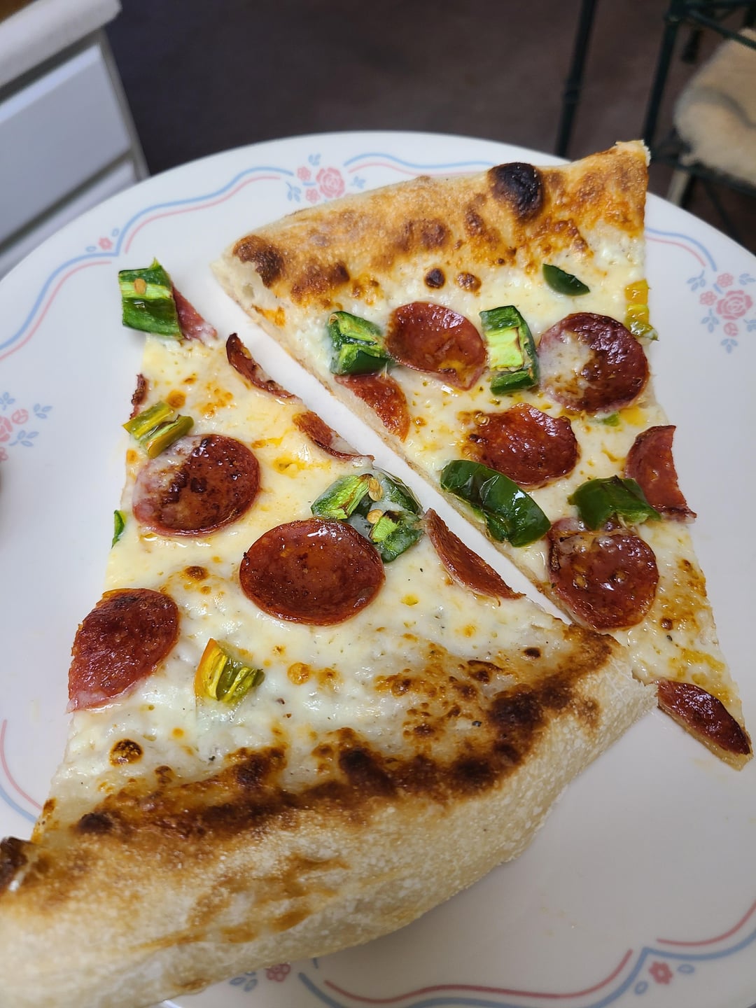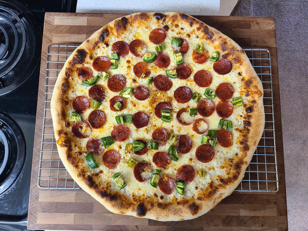 Hand-sliced pepperoni, jalapeños and serranos peppers, (my own) garlic white sauce, fresh shredded mozz and provolone!