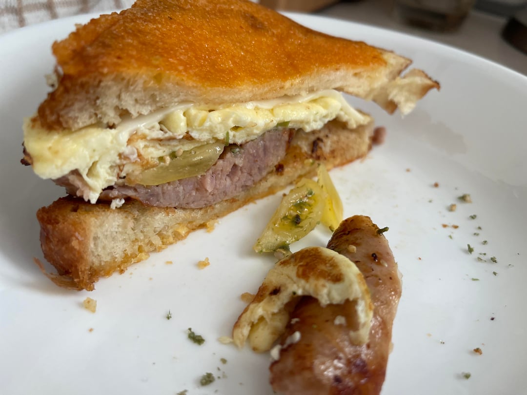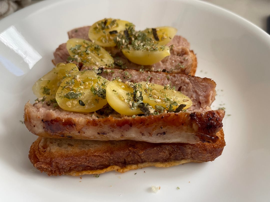 Fluffy egg, tomatoes from the garden sprinkled with furikake, two halved country sausages, a slice of American on toasted croissant bread with a smoked cheddar cheese crust by Meowserspaws 2 Comments SCSteveAutism 2 days ago  TheDarbiter 2 days ago Those tomatoes look BEAUTIFUL