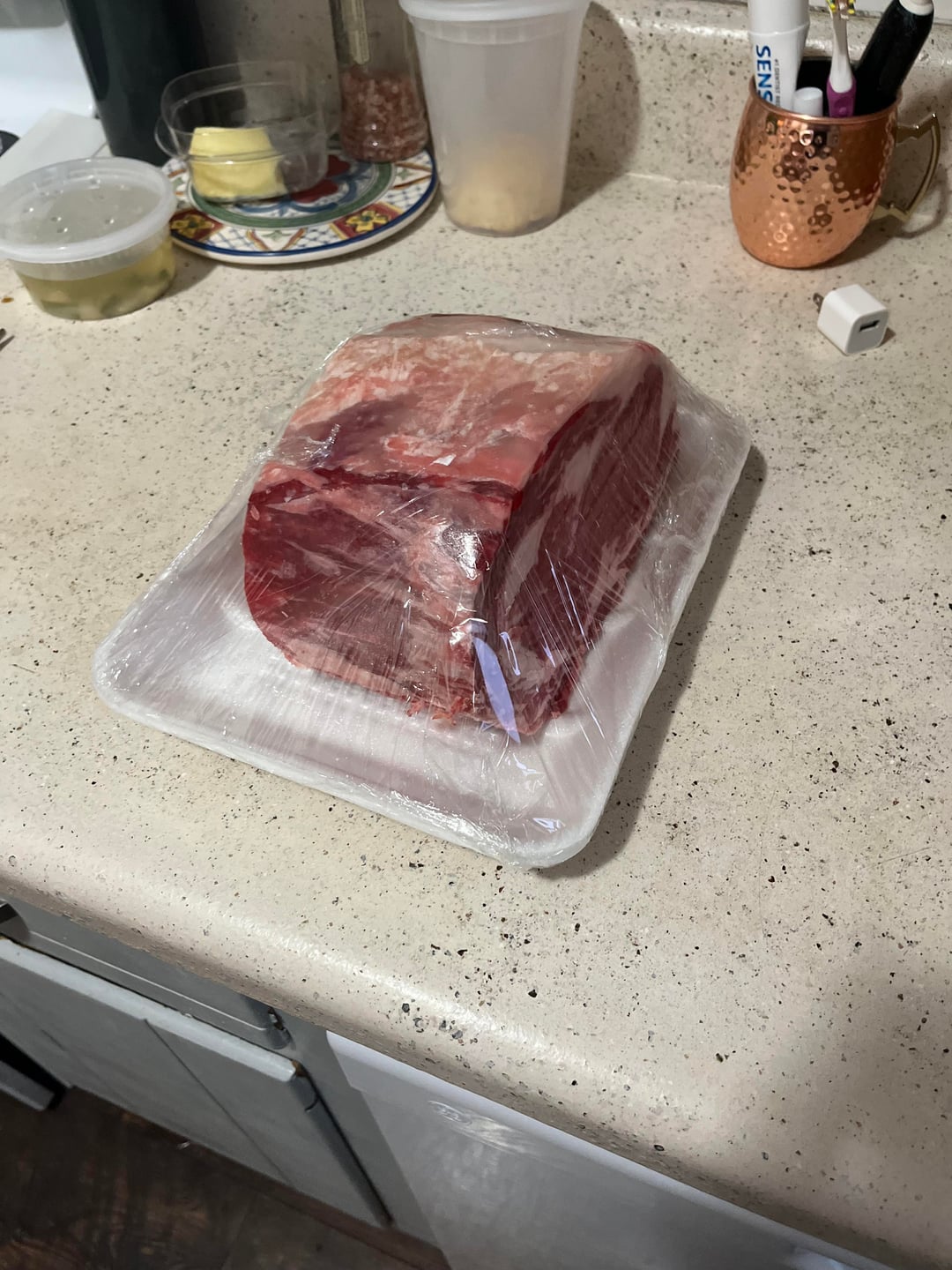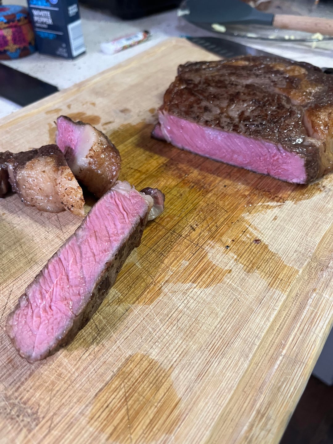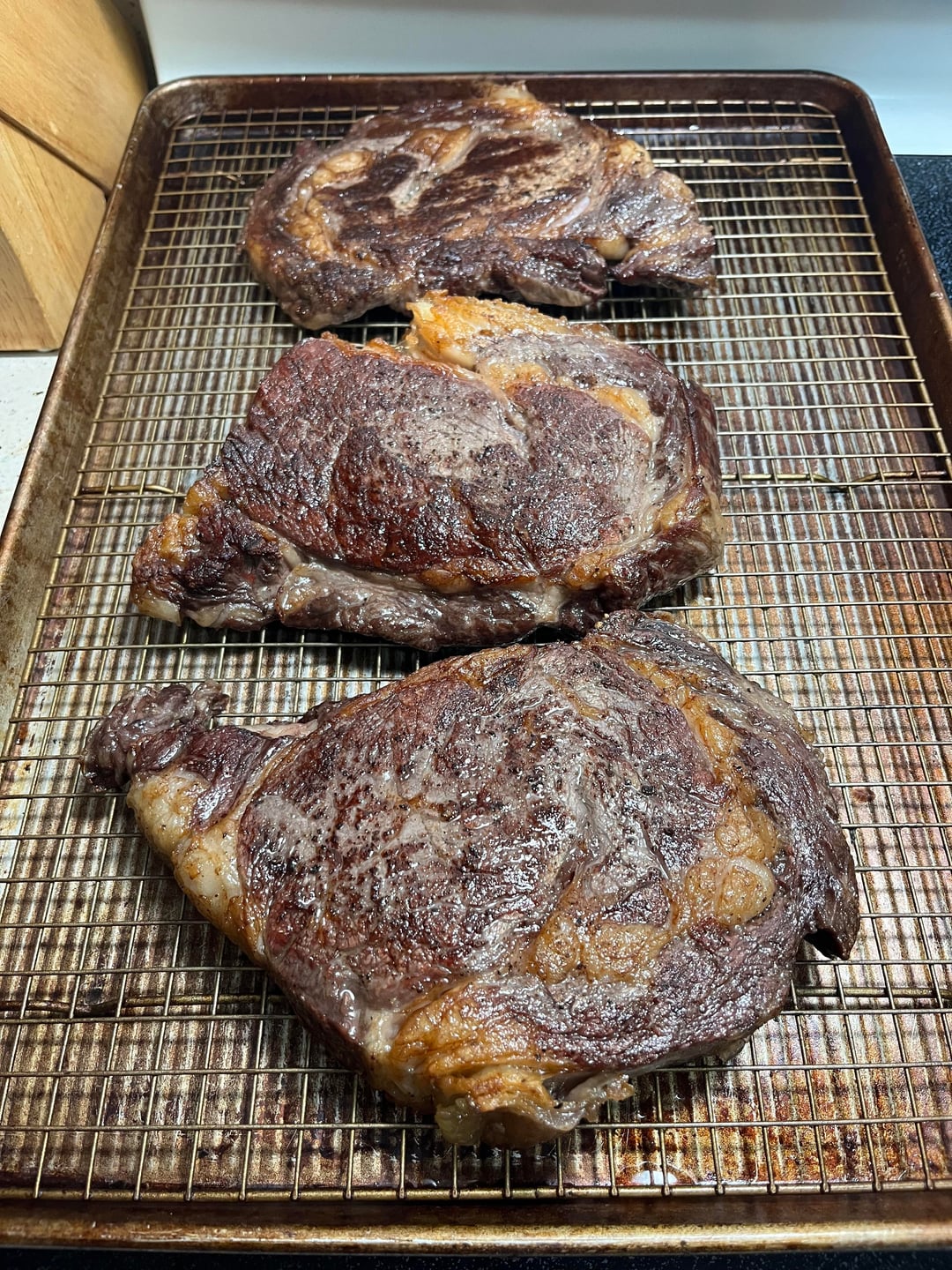 Grabbed a 5 lb hunk of ribeye and cut three thick steaks. Reverse seared ‘em at 275 for about 45 minutes til the temp was around 118 and popped them in the fridge for 15 minutes before patting them dry and searing on a cast iron.