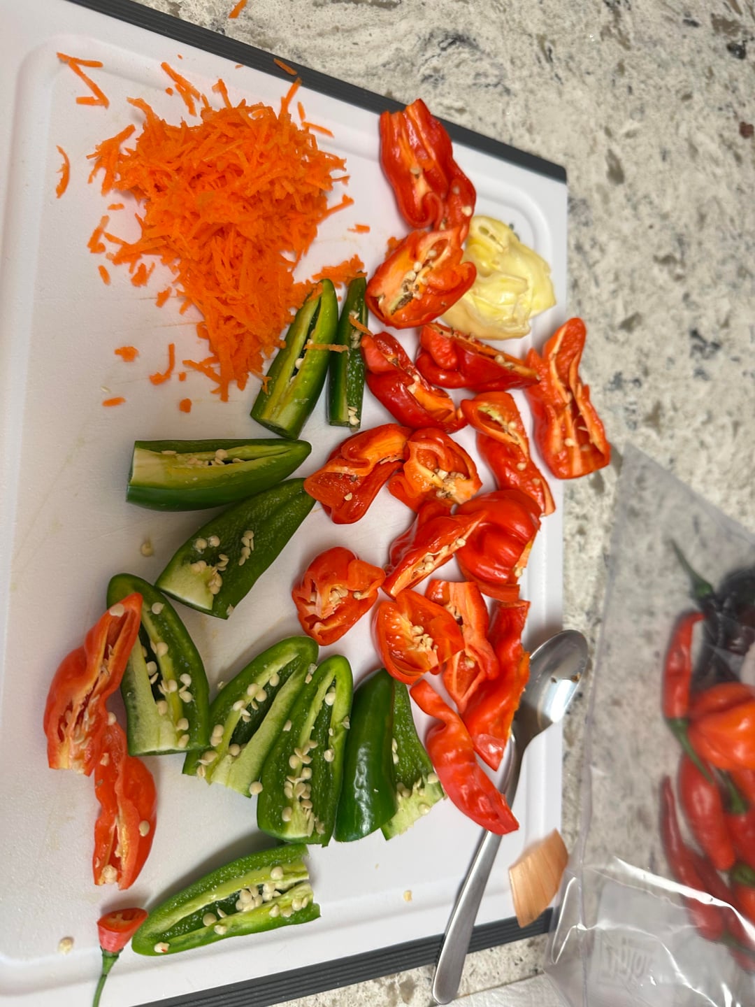 Half onion and 5 garlic cloves lightly fried in a cup of oil. Save the oil for blending later