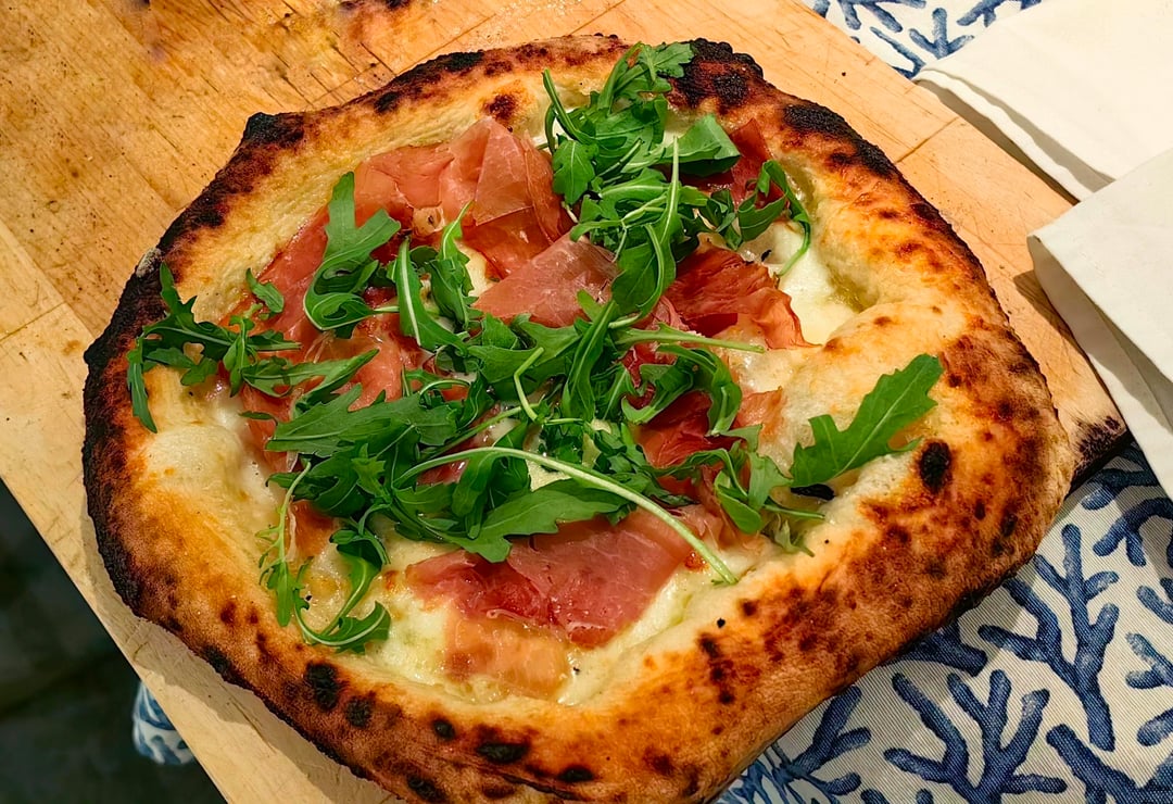 Just generic strong flour, cheap mozzarella and parmesan from Lidl, ok jamón serrano, arugula, basil, olive oil.