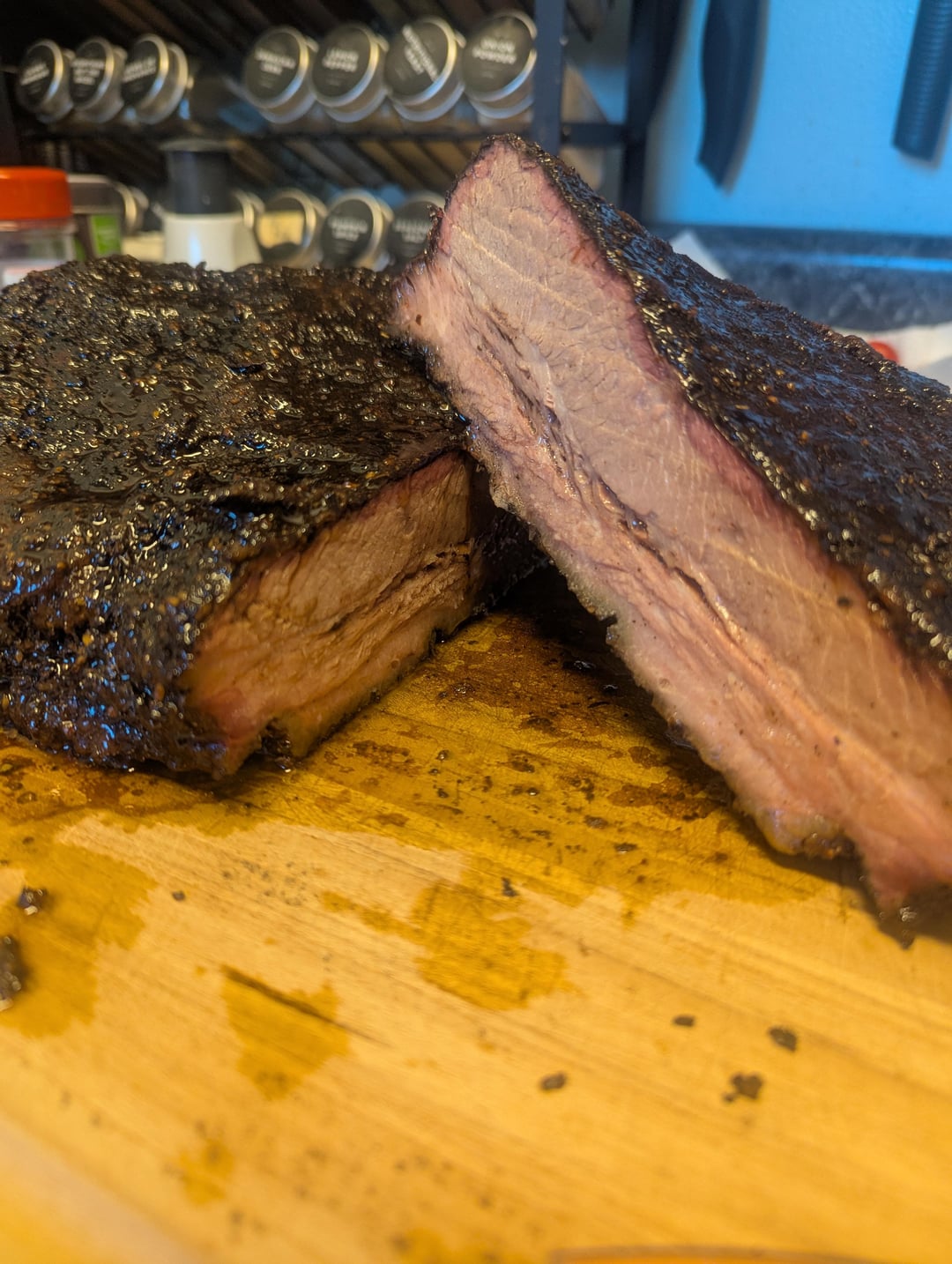 - Smoke: ~13hrs at 225f, pulled whem the flat reach 190f (no wrap during smoke)
