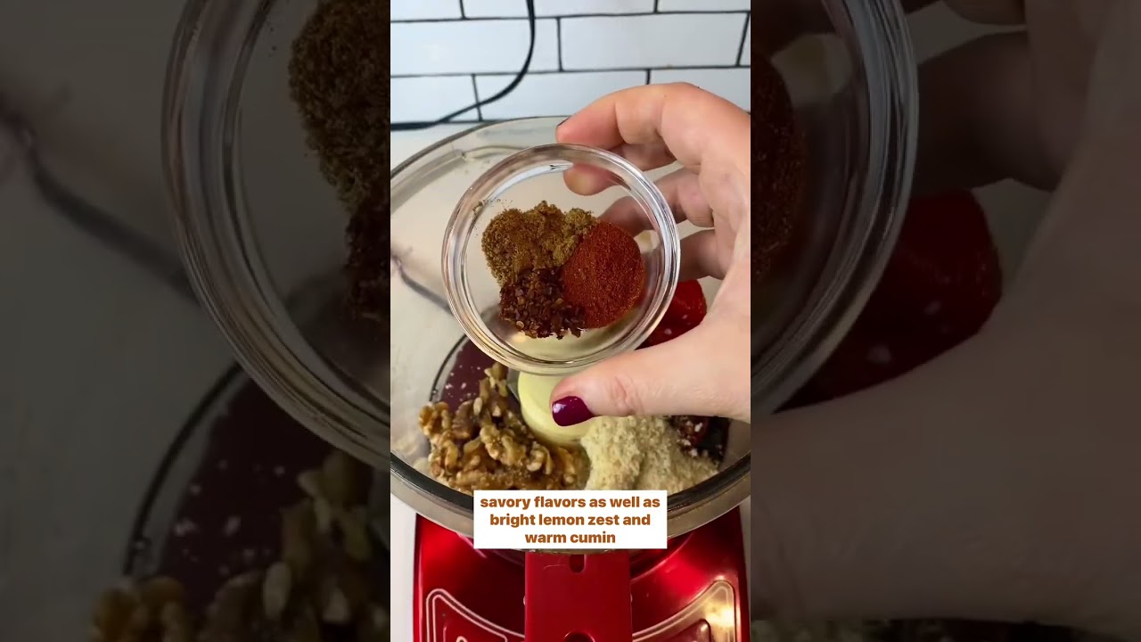Smoky, savory and aromatic, Muhammara is a delicious Middle Eastern red pepper and walnut dip that is flavored with tangy pomegranate molasses, bright lemon and warm spices.