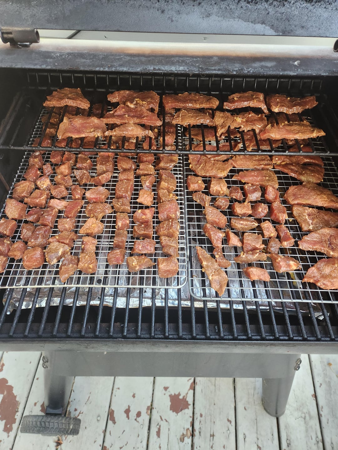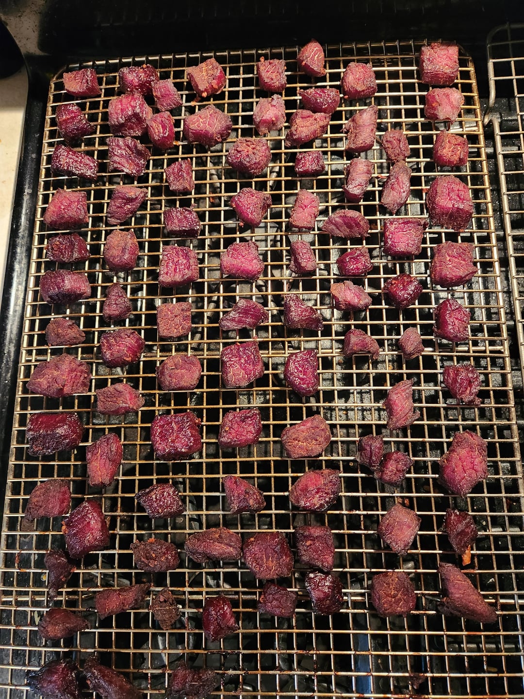 I usually slice sirloin 1/4" thick, but decided to mix it up today. Instead, I diced up some eye of round and threw it in the marinade overnight. When I woke up, I drained the marinade and put the beef on at 180°. The sliced jerky normally takes 4 hours, but the thickness if the nuggets added about 2 additional hours. If you like jerky, give this one a spin.