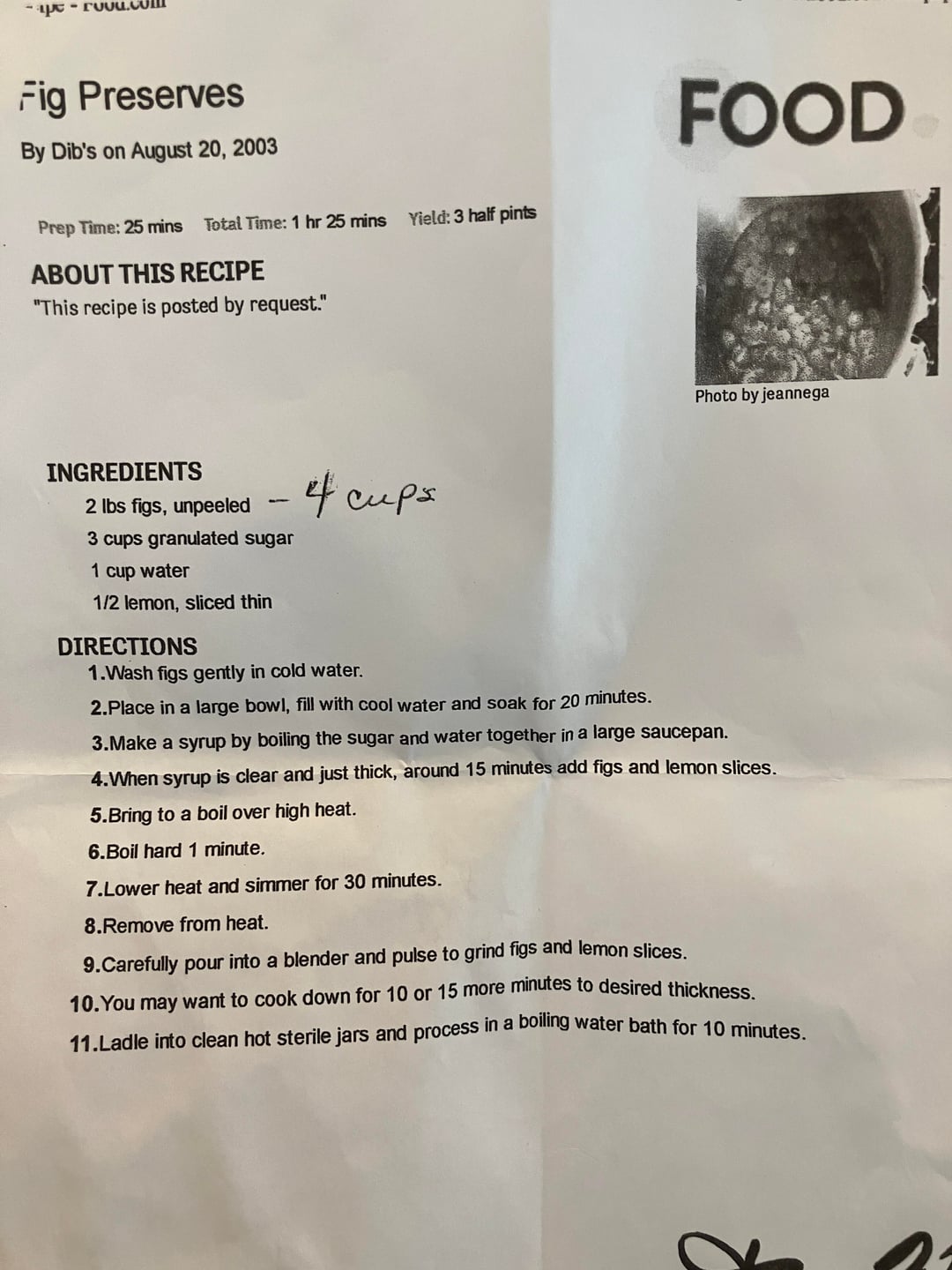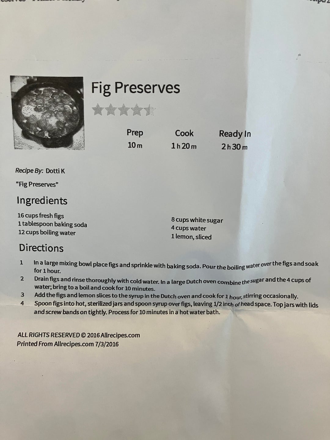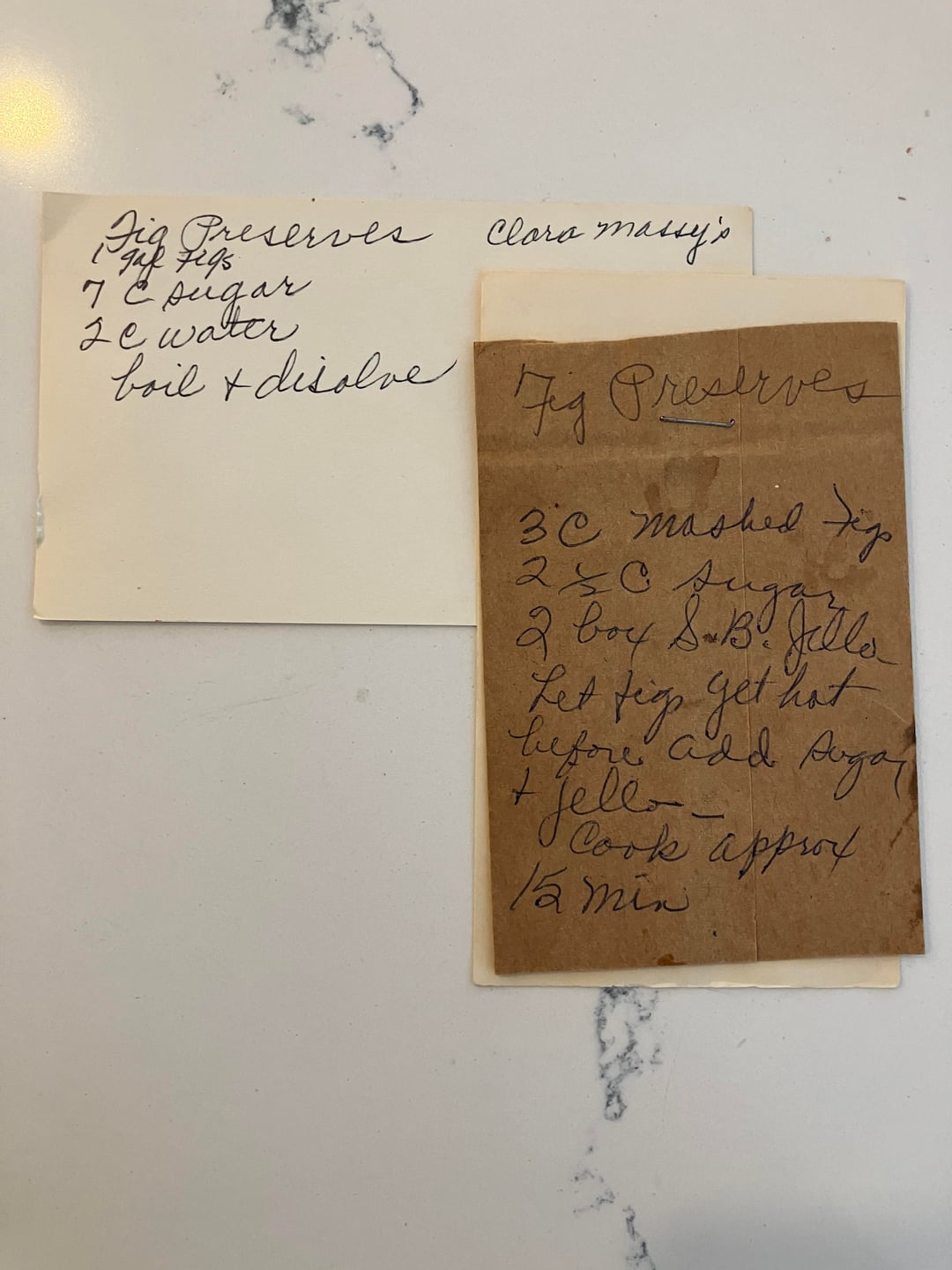 Grandmother made the best fig preserves. They were picked from her back yard, big chunks of fig, and a golden brown jam. I’ve tried to recreate her recipe (brown card) but it was incomplete. I found a second recipe with not much info in her recipe box. I ended up mashing those recipes and two others suggested from my community all together. My dad and uncle said it was correct but I didn’t write it down and it’s been a few years. Can anyone help me figure it out?