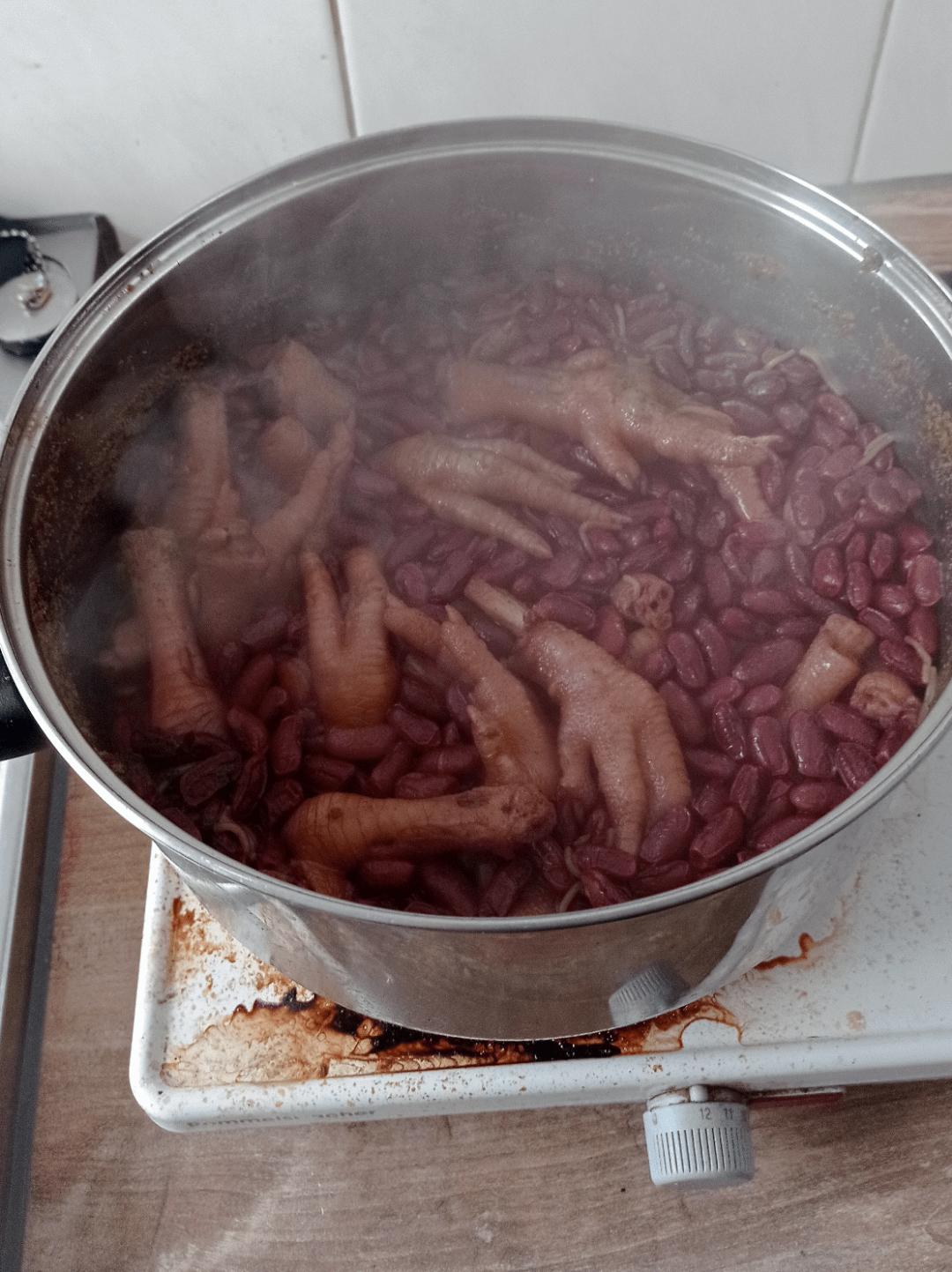 Chicken feet are great for the collagen they release. Those beans need more liquid, tho.