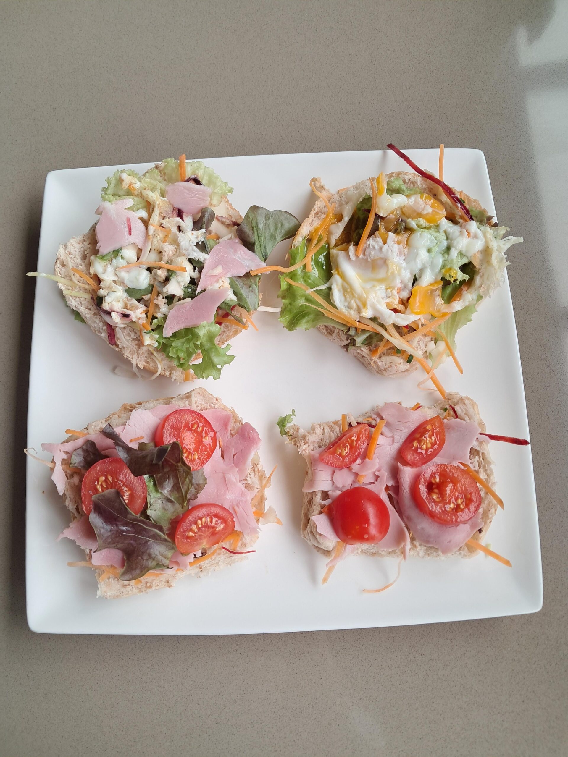 2 soft bread buns, slice of ham, egg, raw veg of choice
