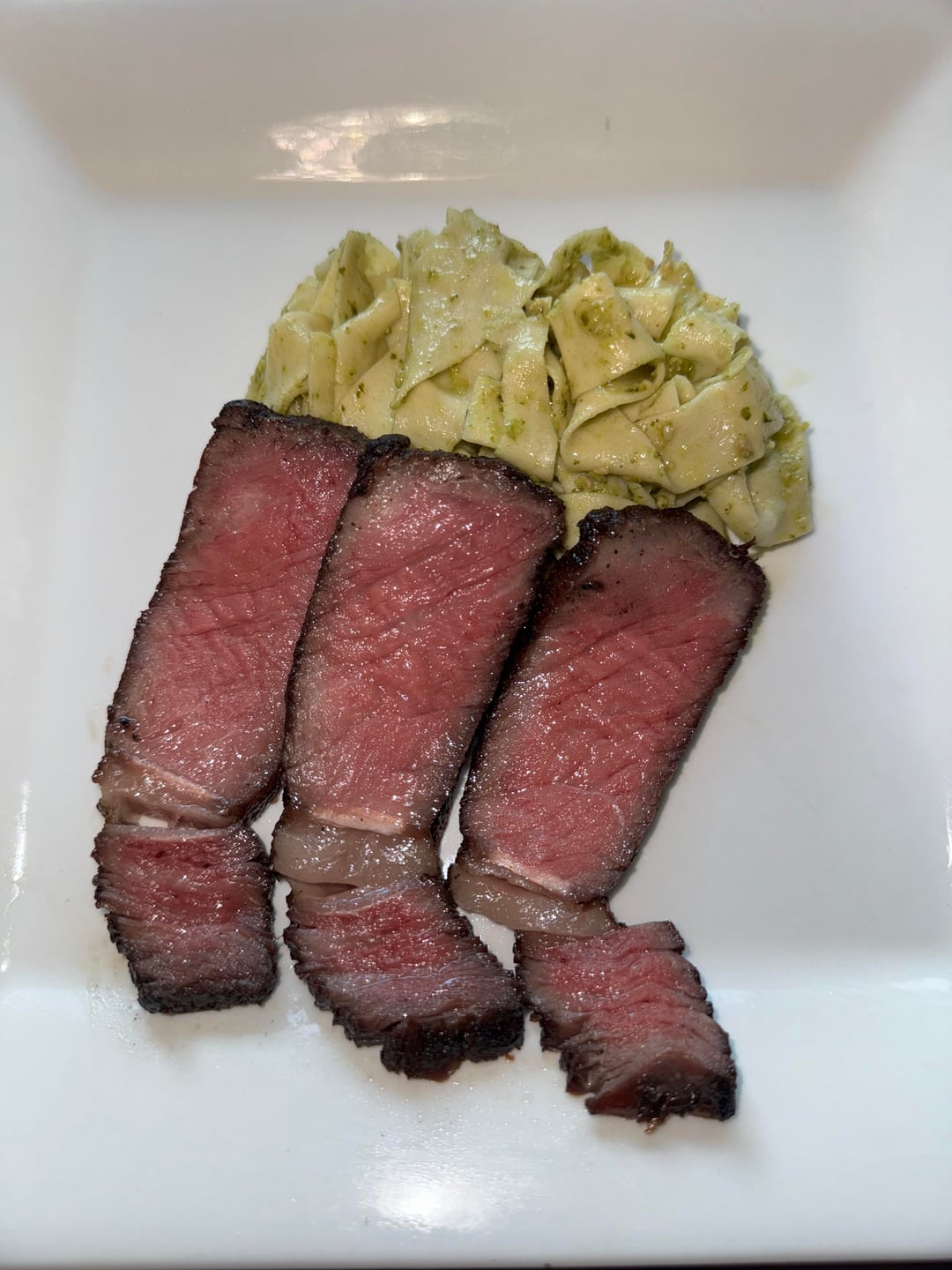 Nice 2 inch thick 60 day dry aged (at home) prime ribeye, SPG and into the sous vide @137 for 2 hours and seared over coals after a quick chill in the freezer. Super happy with the results, wouldn’t change a thing on this cook. Paired it with my first homemade pasta tossed is pesto and Parmesan.