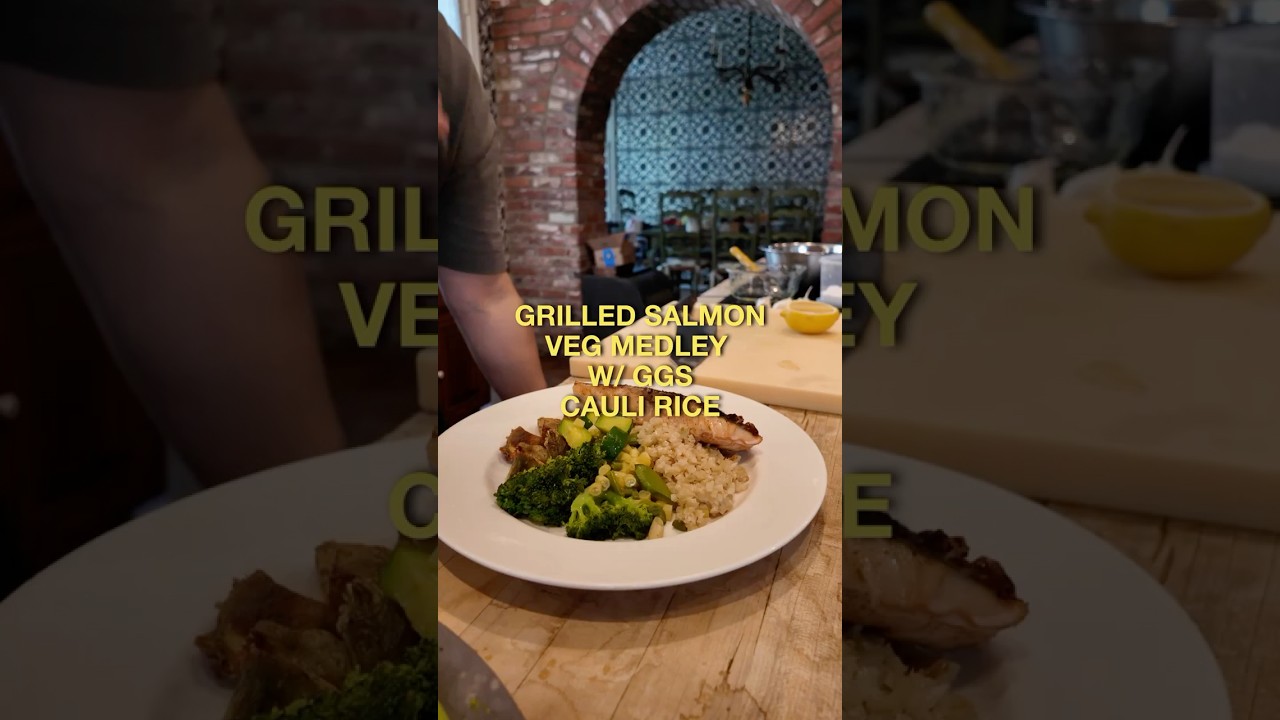 This is what I made as a personal chef in Beverly Hills. As some of you guys know, we get weekly shipments from the Santa Monica Farmers Market every Wednesday, and we don’t get to choose what arrives. Most of the stuff we get, my clients enjoy, but string beans are not their favorite, but since we do get them pretty often, I found that they enjoy them most when they’re cut up into little rings. And of course, sugar snap peas. When they’re in season, we get them every week. Luckily, they like them either simply steamed or just quickly sauteed. One of my clients also really enjoys steamed broccoli, while the other prefers roasted, so I make sure to always cook them both ways. Today’s lunch request was salmon, so I seasoned them up with the Fiesta rib rub, avocado oil, and fresh garlic. They’ve actually been really liking the rib rub on fish. I loved reading all the comments on Fiesta spices. I’ve never heard of them before, but they seem to have a lot of fans. I know this is going to ruffle some feathers. We get artich chokes from the farmers market, but they do not like the work involved with eating the leaves or even have. So, I steam them, remove the leaves, the choke, quart the hearts, and I roast them until they get super crispy. This they absolutely love, but sadly there is a lot of waste. For the veg medley, I start off by sautéing some zucchini slices since they take the longest. Once they get some color, throw in the sugar snap peas and then the little rings of string beans. I gave them a quick hard sauté just to take the raw edge off and season with this ginger garlic scallion sauce. They didn’t want carbs today. So, I used cauliflower rice instead, which I gave a quick sauté, seasoned with salt and the rest of that ginger garlic scallion sauce. As everything is finishing up, I throw my salmon on the grill and get that skin nice and crispy. I like to get my grill ripping hot and I cook the salmon skin down on the top rack so that it has time to render and crisp up without being absolutely scorched. Then, a quick flash on the flesh side to give it that char flavor and it’s ready to serve. To plate, I add the crispy roasted articho carts, steamed broccoli, the sauteed vegetable medley, cauliflower rice, and then the grilled salmon. And of course, a touch of lemon juice just to brighten up all those vegetables. By the way, proteins should always be presented skin side up. If it’s skin side down, it means they’re hiding something. A carbless, light, healthy, simple lunch with lots of fiber.