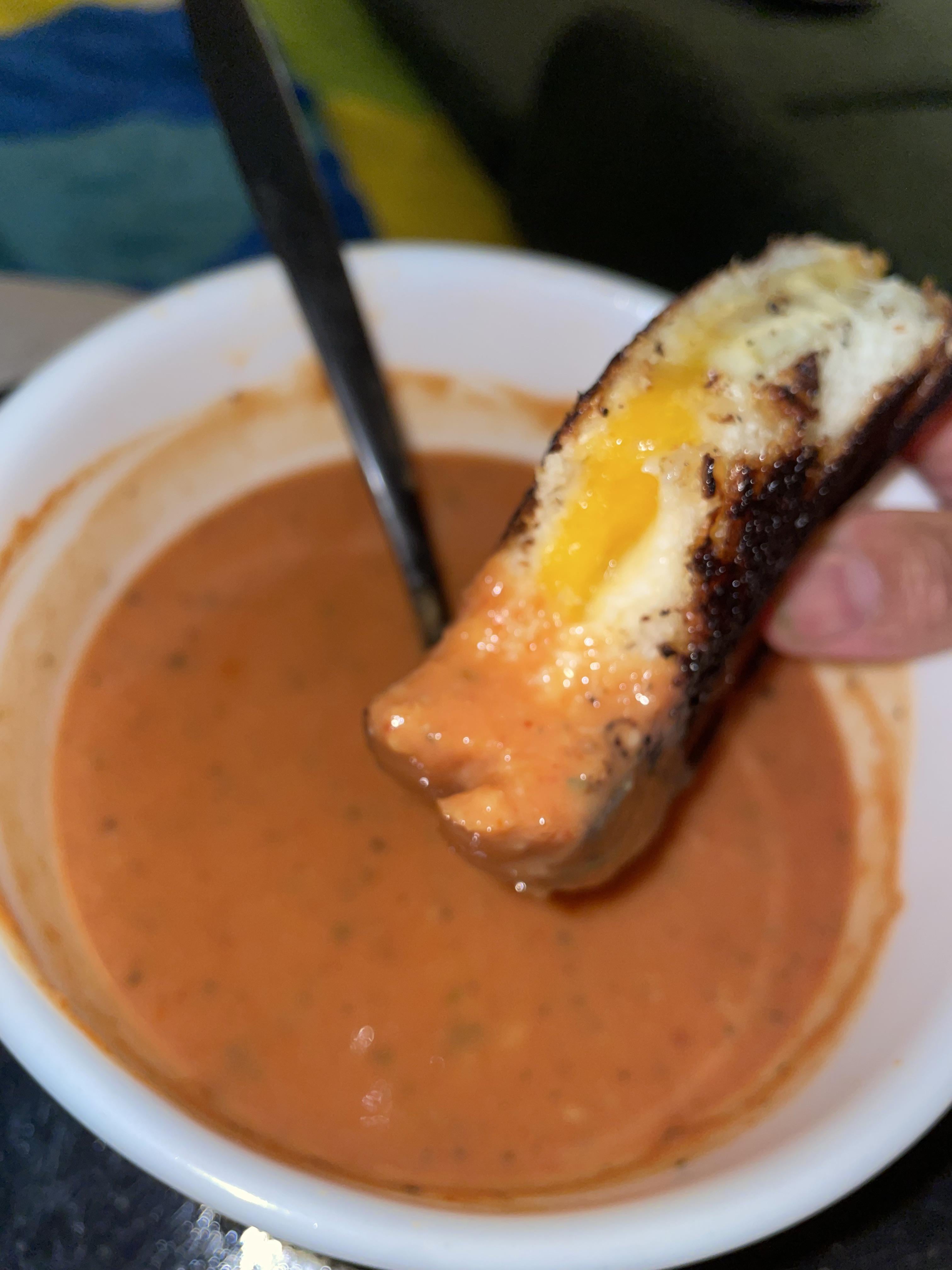 Artesano bread, muenster, and sharp cheddar cheese. Dressed up canned tomato soup with whole milk, grated Parmesan cheese, garlic powder, pepper, Italian seasoning, and cayenne pepper. 10/10 pregnancy craving