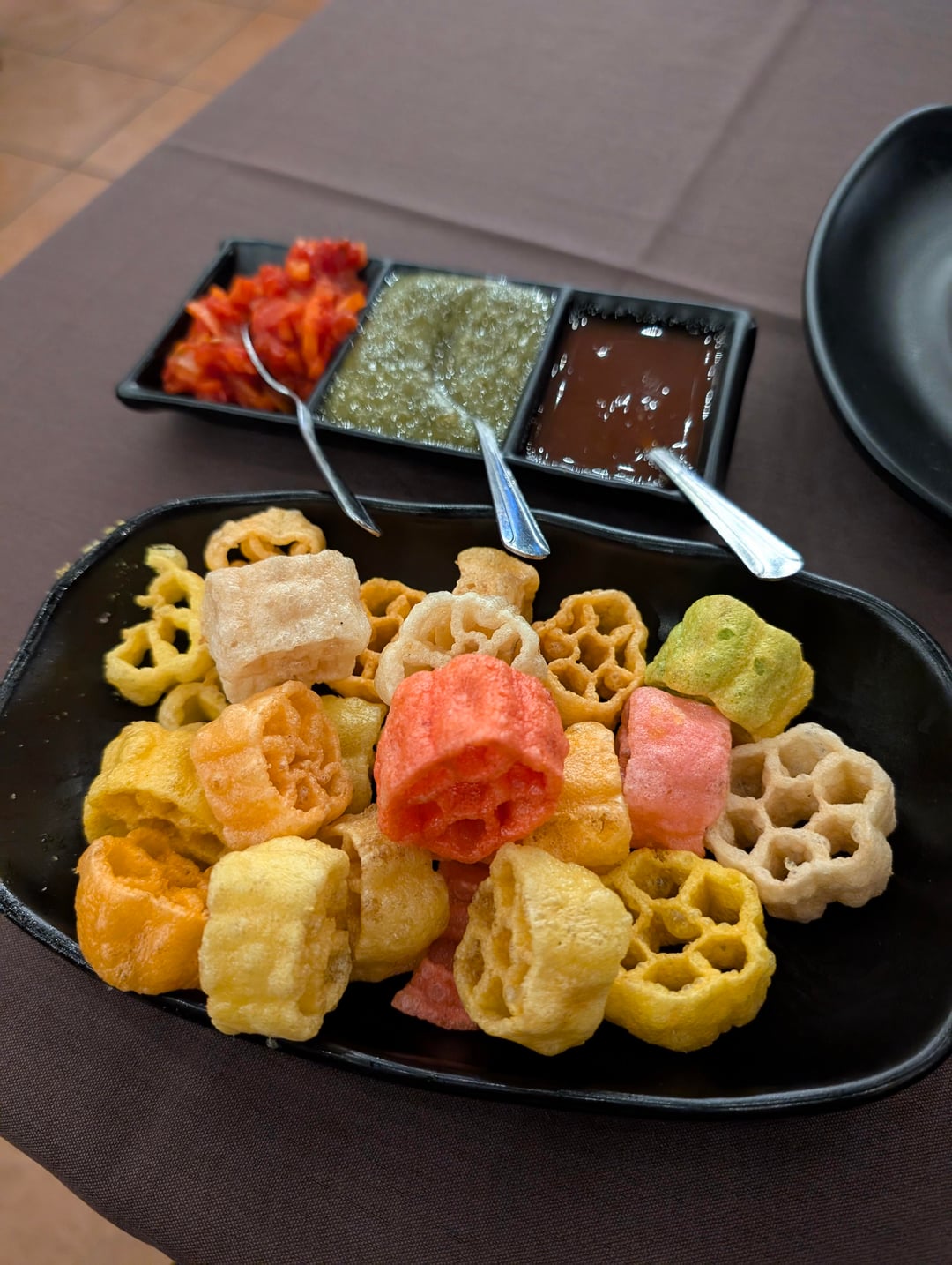 I'm not exactly sure what the colorful chips are called. They're complimentary. Came with grated carrot dip, green chutney and tamarind chutney.