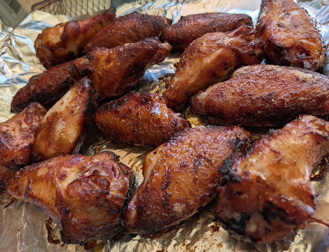 I missed all of PDX Wing Week again, so I made myself a pile of wings again. Brined, Nashville Hot seasoned, mesquite smoked then air fried. Tossed in Thai peanut with blueberry preserves, soy with gochujang, and Cholula Caliente with my house death sauce. All three sauces were very nice.