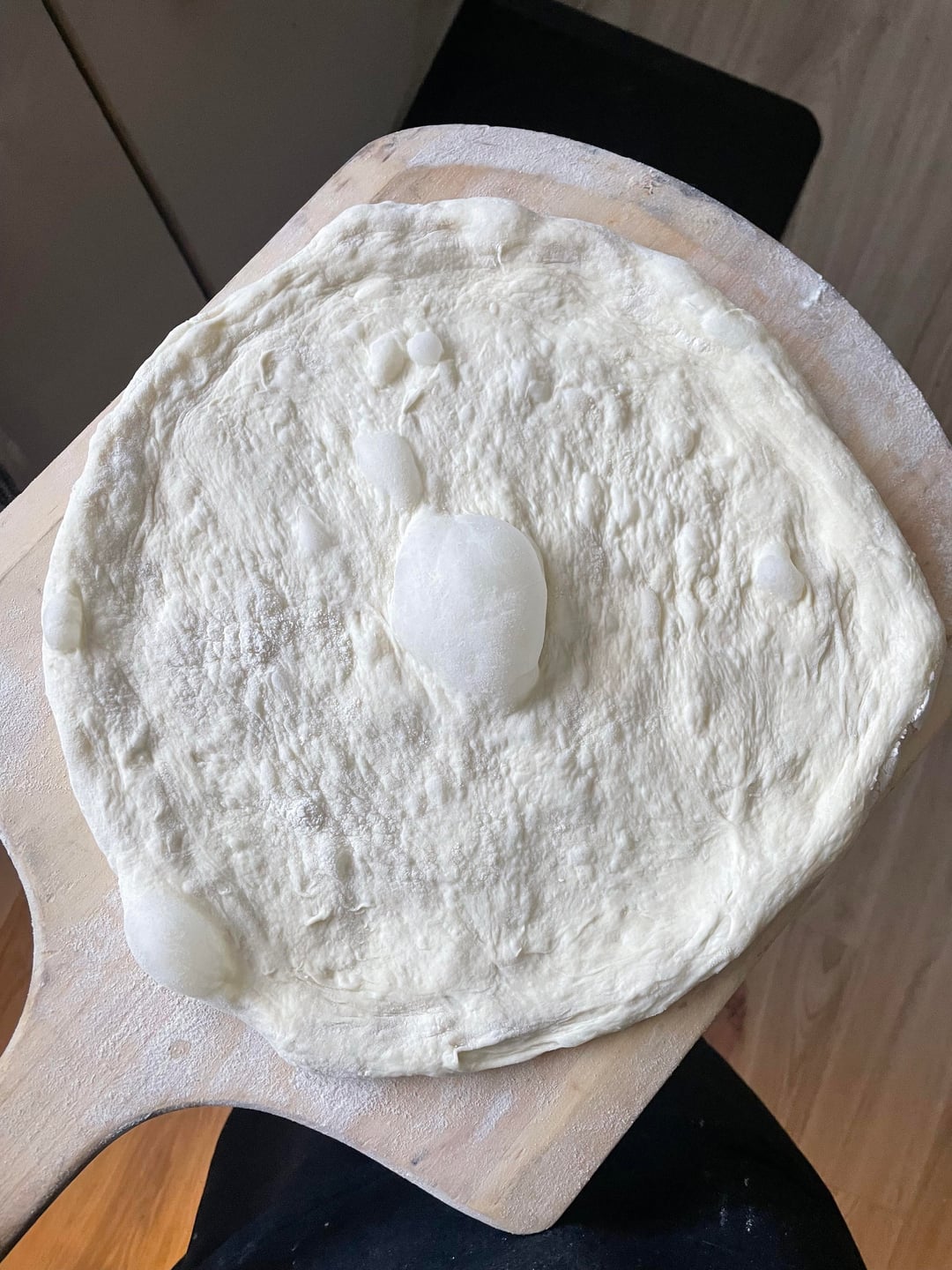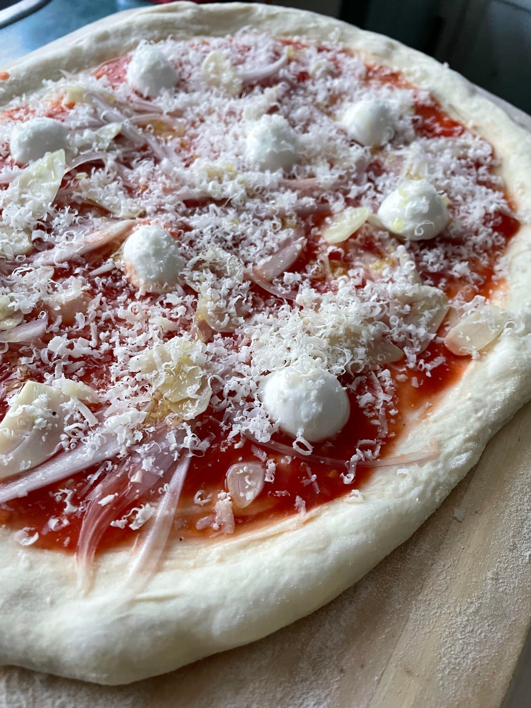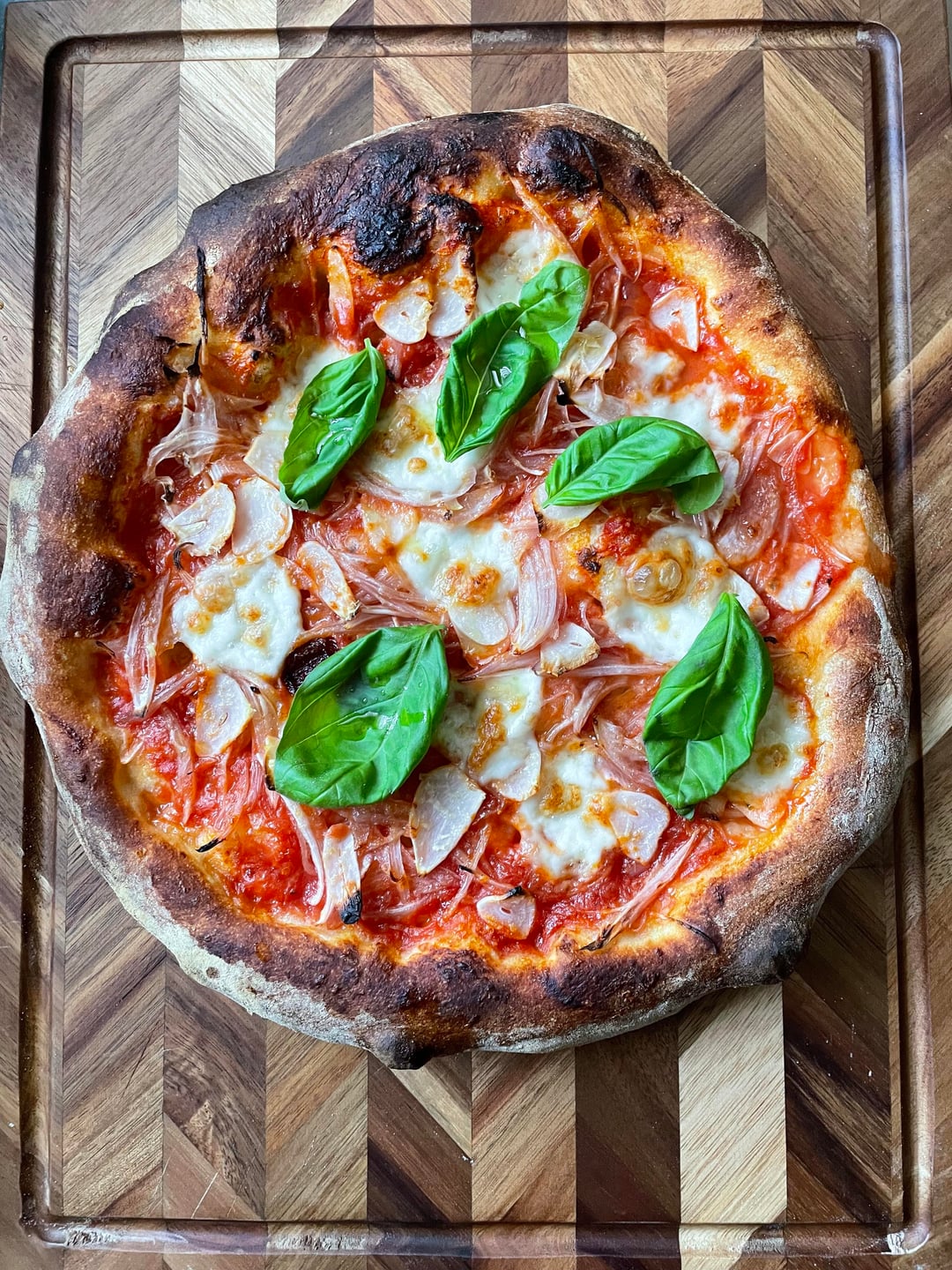 Garlic goodfellas thin, shallots, buffalo bocconcini, hand crushed tomato sauce, basilby toughplaydough Dining and Cooking