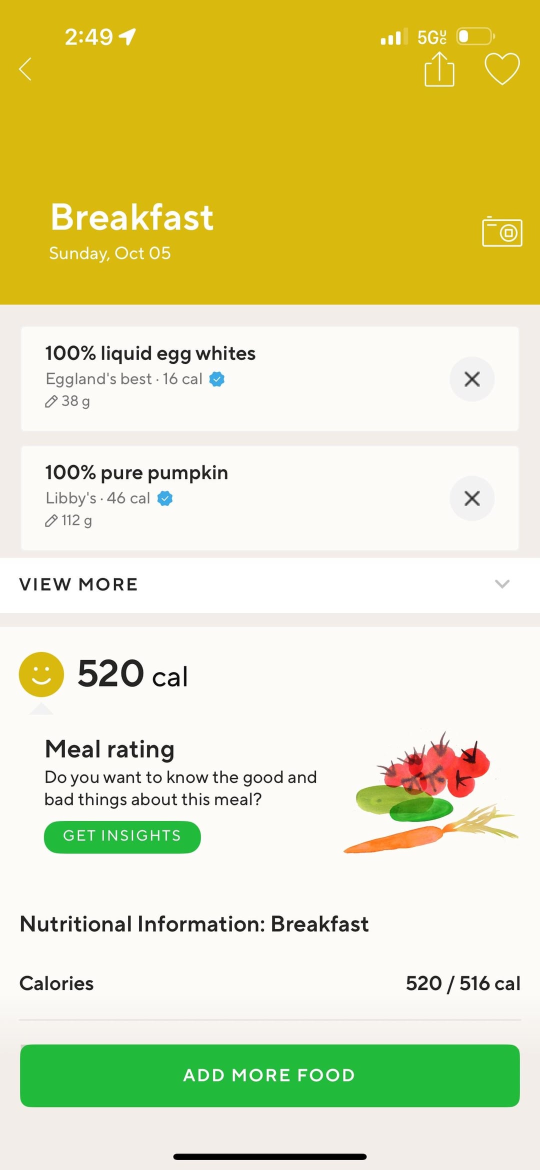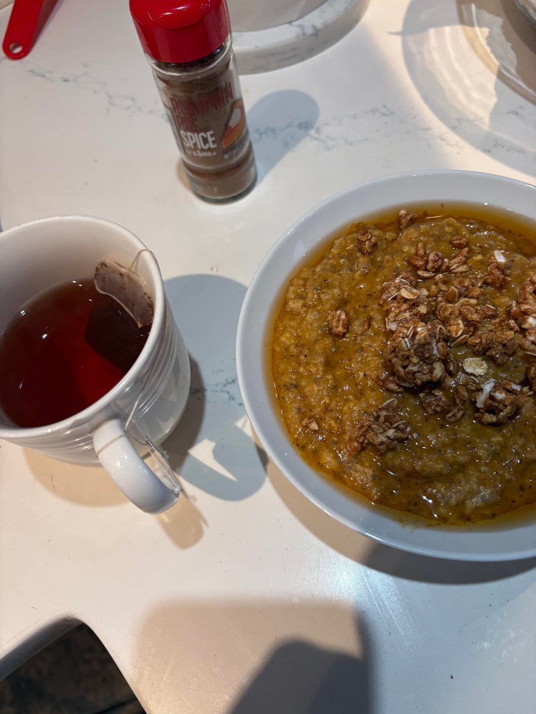 40g oats, 221ml vanilla almond milk, 6g chia seeds, 7g ground flaxseeds, 20g collagen peptides, 112g libbys pumpkin puree, 40g egg whites, 11g kashi go cinnamon crunch, stevia , 26g maple syrup and pumpkin spice seasoning. 520 cal total, 34g protein