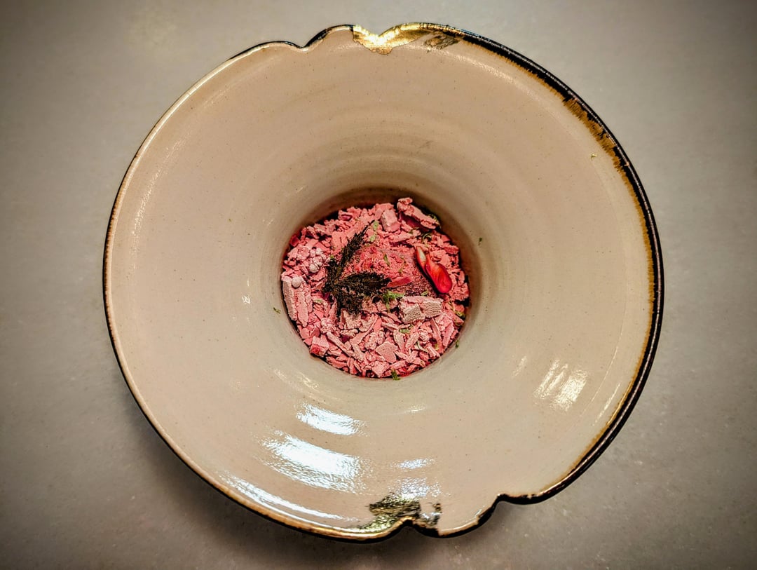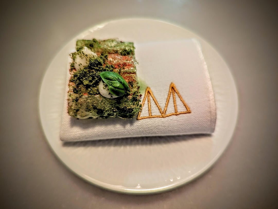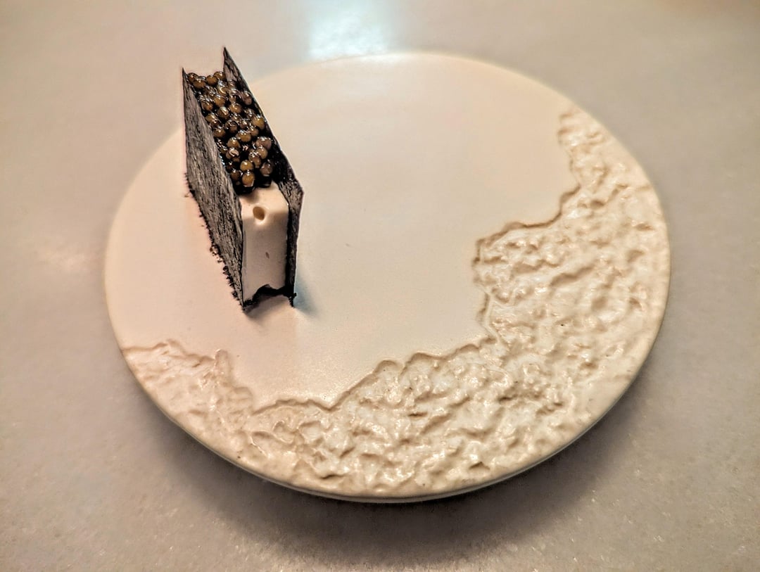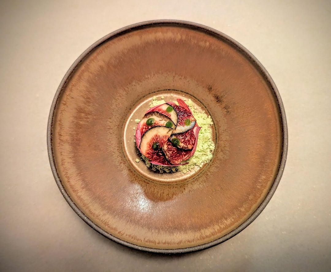 The rice sandwich with nori and caviar was light and creamy (barely a hint of umami from the nori), the raspberry and hibiscus dessert was bright and slightly tart, and the fig dessert was lovely to look at but didn't quite achieve a satisfactory balance (flavours were overwhelmed by the powder atop which the fig arrangement sat).
