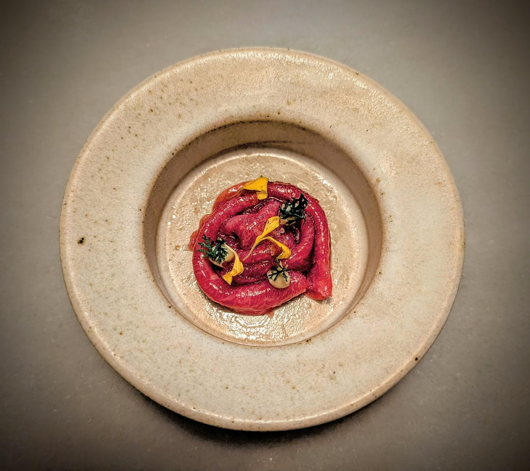 In terms of service and ambience, Mont Bar punches above one star; servers are chatty and bedecked in suits, tables are interspersed with jutting marble counters where solo diners can enjoy a meal, and music is kept low as there is a decent (but not overwrought) amount of explanation that comes with each dish.