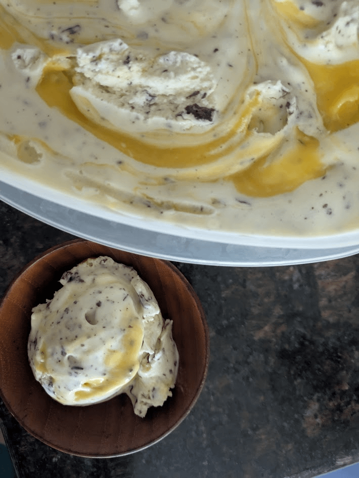 i used jeni's base (https://www.saveur.com/article/Recipes/Jenis-Ice-Cream-Base/) recipe and steeped in fig leaves and used a passion fruit curd recipe i found on the sub, below. spinning in the melted chocolate (70& belize) was harder than i thought. using the KA freezer bowl, the paddle handles get in the way, and i ended up with some big bricks on top. the mixer started skipping before i was totally done, but happy for my first try at it. thanks to you all for your inspiration!