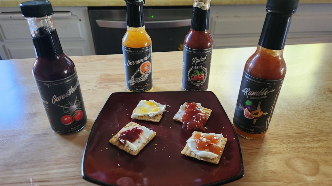 Jeff, the Chief Spice Officer included a bunch of recipes to try with these sauces, and I will for sure. For now, I tried them on a triscut with plain philly cream cheese. All were great, I would say my favorite was the Rumble and then Screamsicle. The flavors on these two really popped for me. The Rubus and Sweetheart were also fantastic.