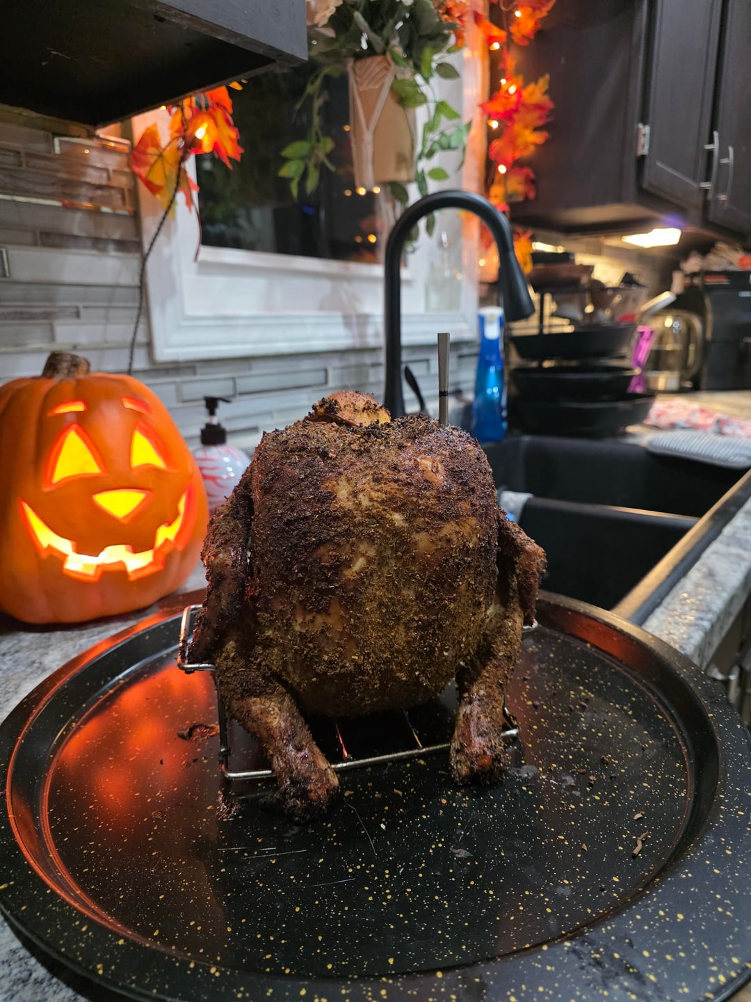Wanted to try a beer can chicken over the weekend. It turned out juicy, tender and a lil bit haunted just the way we like it. Smoked a 7lb'r @ 400° on the Woodridge Pro until internal of 165. This helped the skin get spooky crispy even for a Traeger. 🤓 Fam was happy with the end result which in turn made me happy. Fun cook!