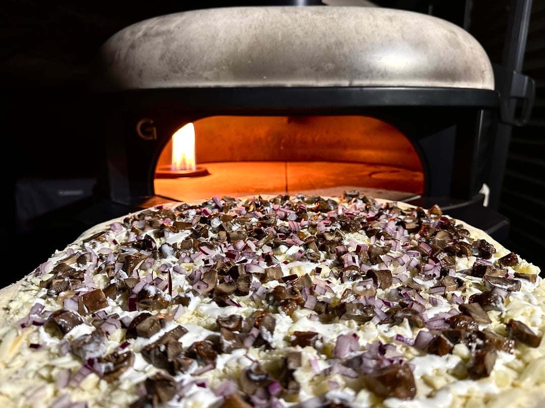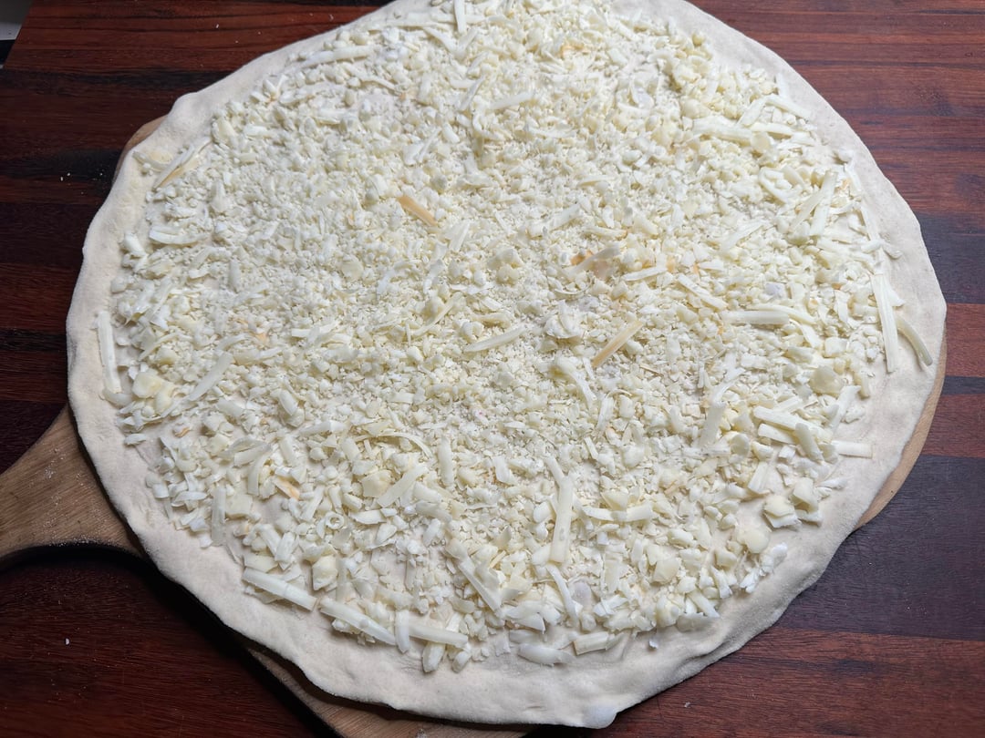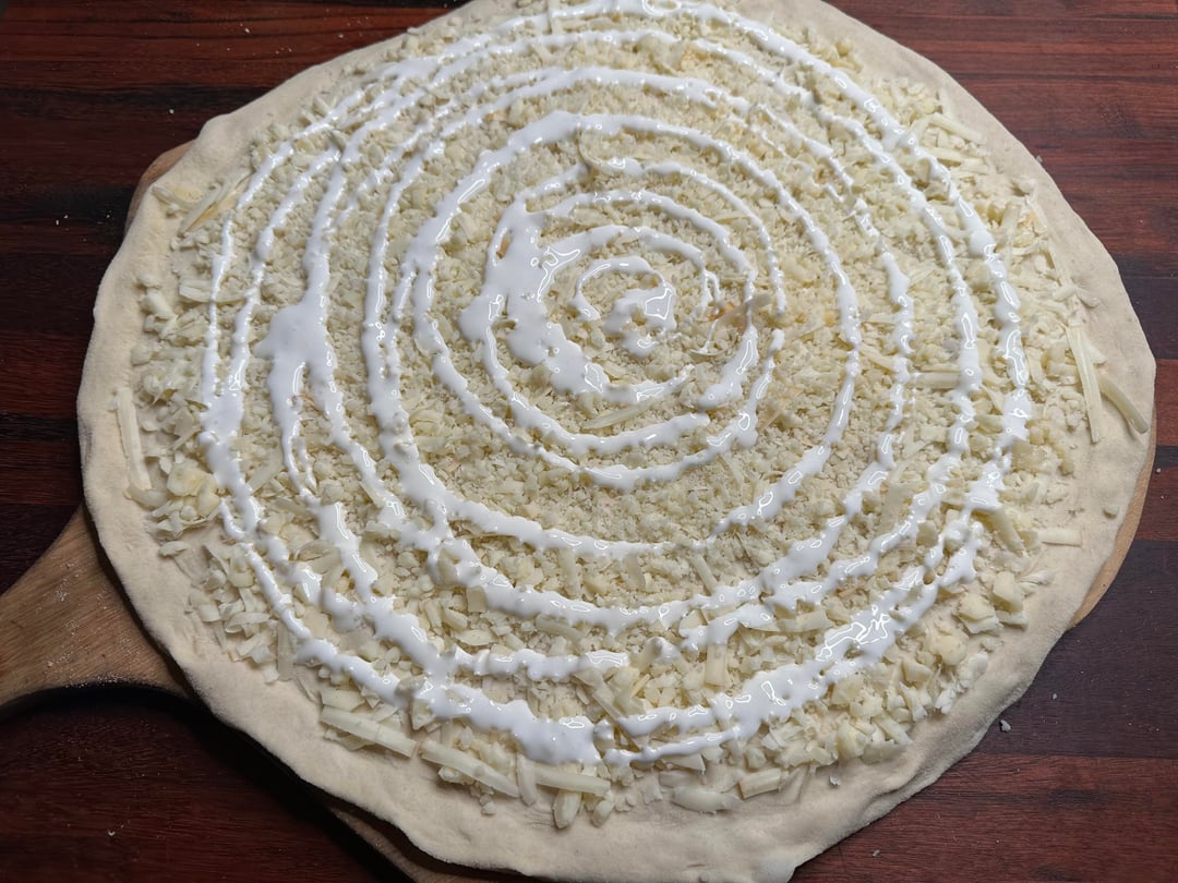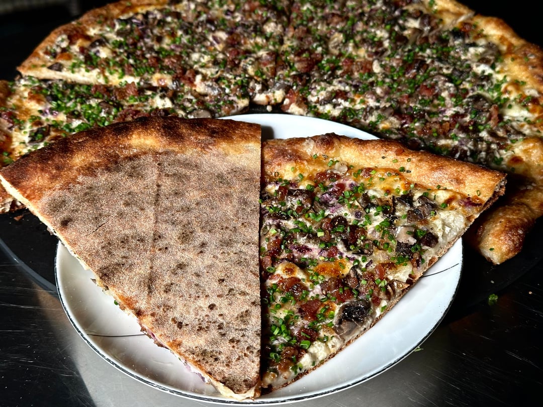 This pizza was inspired by the mushroom pizza at Ceres in NYC. I made my own tweaks, and it really worked! Mozzarella, Scamorza, and smoked Gruyère mix, Mexican Crema, grated Pecorino Romano, diced smoked Crimini mushrooms, diced red onions, and crumbled bacon. Finished with mushroom bouillon powder, fennel pollen, and lots of chopped chives. Then garlic butter on the crust. This really came together nicely and exceeded my expectations.