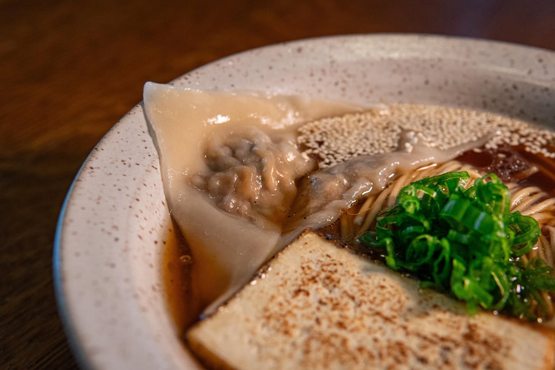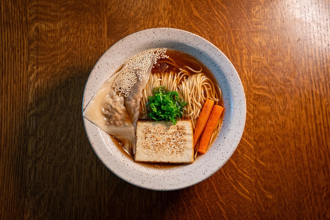 Toppings: Tofu that has been boiled in soy sauce & mirin, then I fry the top for a crispy bite and pan sear the sides. Finish it off with a quick pass of a blow torch. Roasted Carrot tsukemono (instead of menma) as I want to try to utilize as many local & regional ingredients as possible. It’s a different experience to menma, but still brings a nice crunch and sweet bite to the bowl. Wontons are homemade using mushrooms from the broth with TVP, panko bread crumbs.