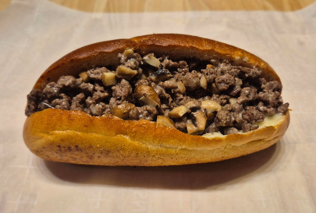 I had done a very coarse grind on beef for meatballs. I had some extra so I made my wife a sandwich. I added baby bella mushrooms and American cheese. I wrapped it for shaping and steaming. I regretted not making my own.