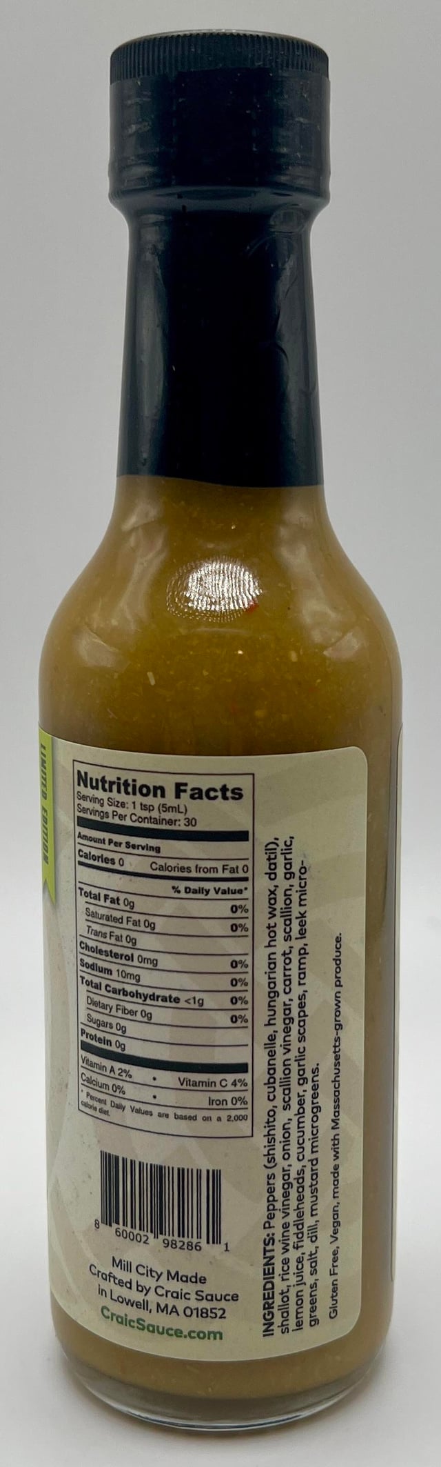I remember the first time I tried fiddleheads, the super floral aroma, the unique green and grassy flavor, the almost crunchy texture, I loved them and searched for them again and again at the grocery store only for them never to show up again. I was looking forward to this sauce to experience that flavor again. In that regard I was a bit let down as while there is some of the flavor of fiddleheads in the sauce they’re very much only one part of an ensemble of flavors instead of the dominant one. Craic Sauce Holy Fiddlehead is super tangy and does have that very fresh green flavor that I love in verde sauces. Three of the peppers used – shishito, cubanelle, and Hungarian wax – all have fairly vegetal and grassy flavors which blend with that flavor of the fiddleheads. The datils should bring some extra heat and sweetness but with the color of the sauce and being the last one on the list I have a feeling there aren’t many of them in the sauce. There is a well-rounded and robust onion and garlic flavor as well which adds some earthiness and sweetness to the sauce, though again it’s hard to pick out individual flavors from the myriad of allium varieties. What does pop out a bit are the mustard greens in the sauce, giving a distinct earthy mustardy background note that I love against the brighter green flavors.