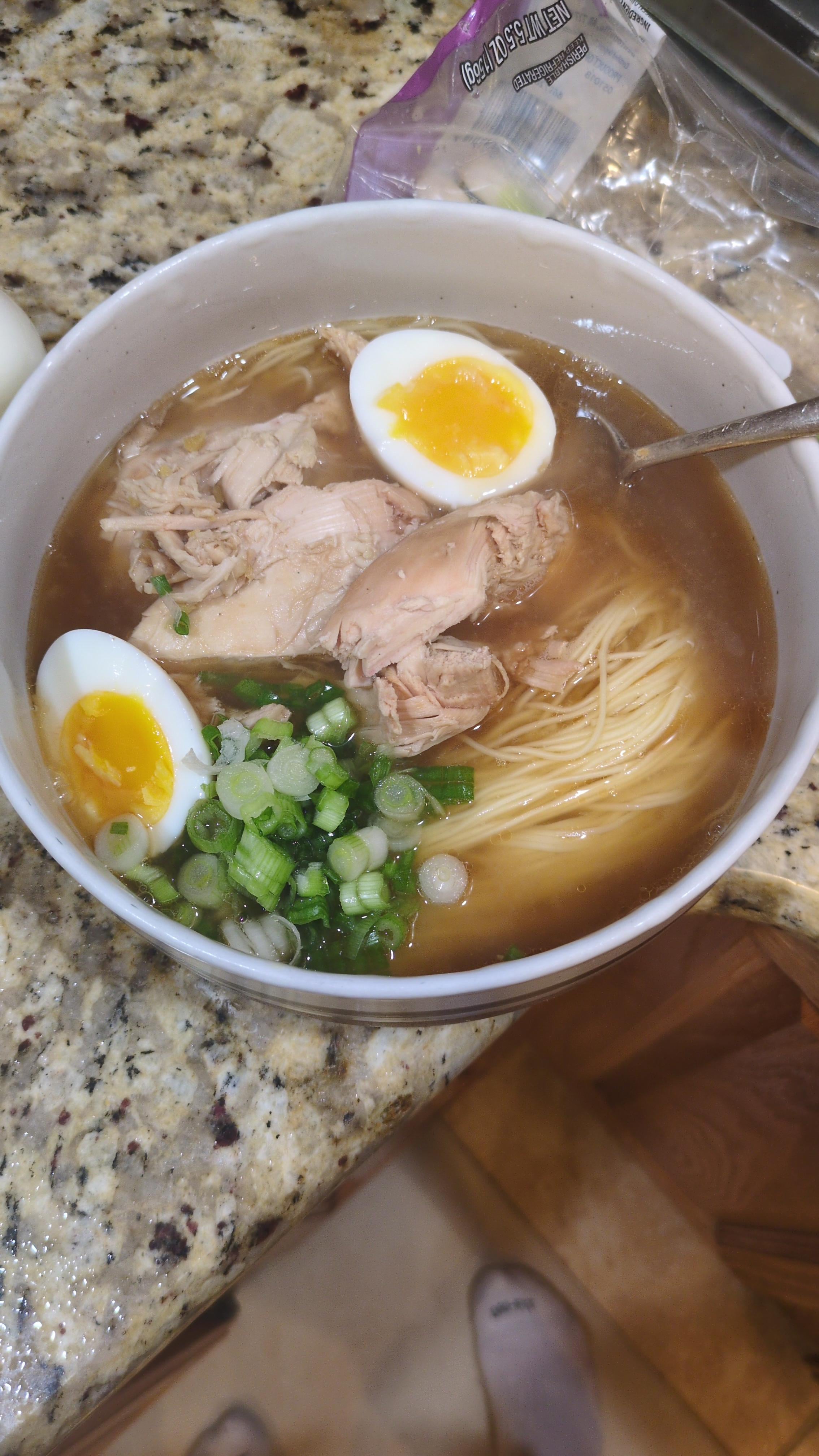 Nevertheless, chicken looks awful, green onions are cut awfully. Celery is not a traditional ingredient for the broth, same with cider vinegar, maple syrup and bay leaves.