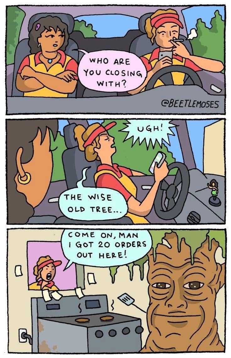 Happy Monday, you beautiful trees!by SockSock81219 11 Comments MaxMischi3f 4 months ago It’s just fuckin, it’s just fucking FOOD man. BotGirlFall 4 months ago The tree’s expression always takes me out Comfortable-Fuel6343 4 months ago Man don’t let that wise old tree motherfucker hit your waxie. I did and he power lung’d a quarter of the cart. probsthrowaway2 4 months ago MrTree just trying to vibe not work too hard. Hypno_Kitty 4 months ago economy is bad sSummonLessZiggurats 4 months ago You either know someone who is the Wise Old Tree, or the tree is you. granolabar1127 4 months ago im in the middle of a mental breakdown right now but this makes me feel marginally better Appropriate_Past_893 4 months ago I fucking love this comic. Every job has a person ypu know you should like, or at least be polite to, but you hate because they suck to work with virus_chara 4 months ago Seems like same fryer/window as from Spongebob! Oshwaflz 4 months ago does anyone here work in a place with the window over the grill? only time ive seen that is spongebob TeMoko 4 months ago Get off your damn phone!!