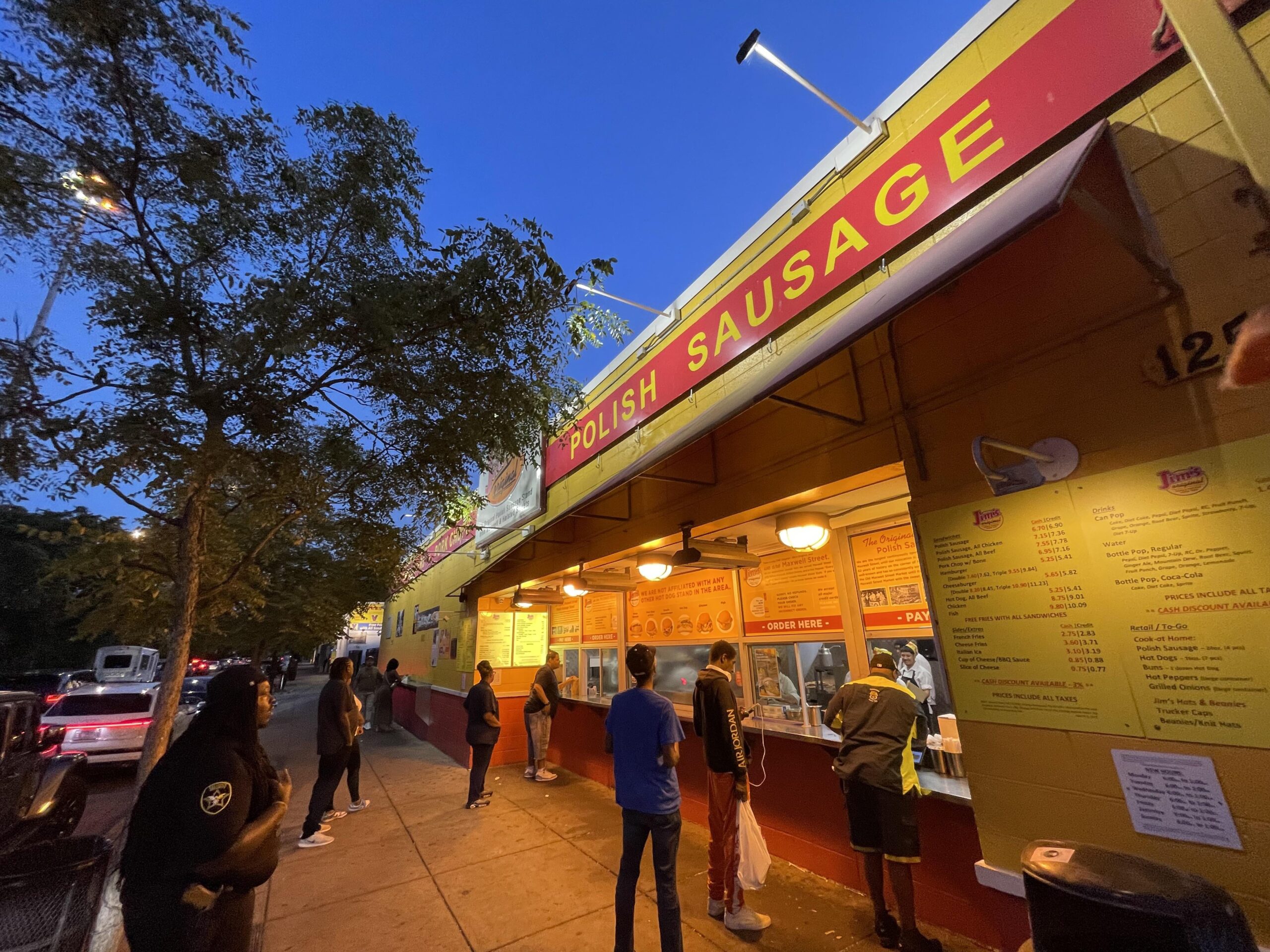 A few years ago friends came into town and for some reason they wanted hotdogs and pizza. Many visitors say these are the top things to try in Chicago. For me, there are many other choices that I would put above those. However, if you go for a hotdog, or in my case a Polish sausage, make sure you get a good one. Jim’s original has been around for decades. It’s amazing how many people come and go from this place in a short period of time. All sorts of people…rich people, poor people, different skin tones, different beliefs, different ages. Sitting here eating my food is super cool to see this cross-section of people from Chicago and elsewhere. Beautiful weather tonight and a clear sky and an all beef Polish with grilled onions. It comes with free fries. What a night!