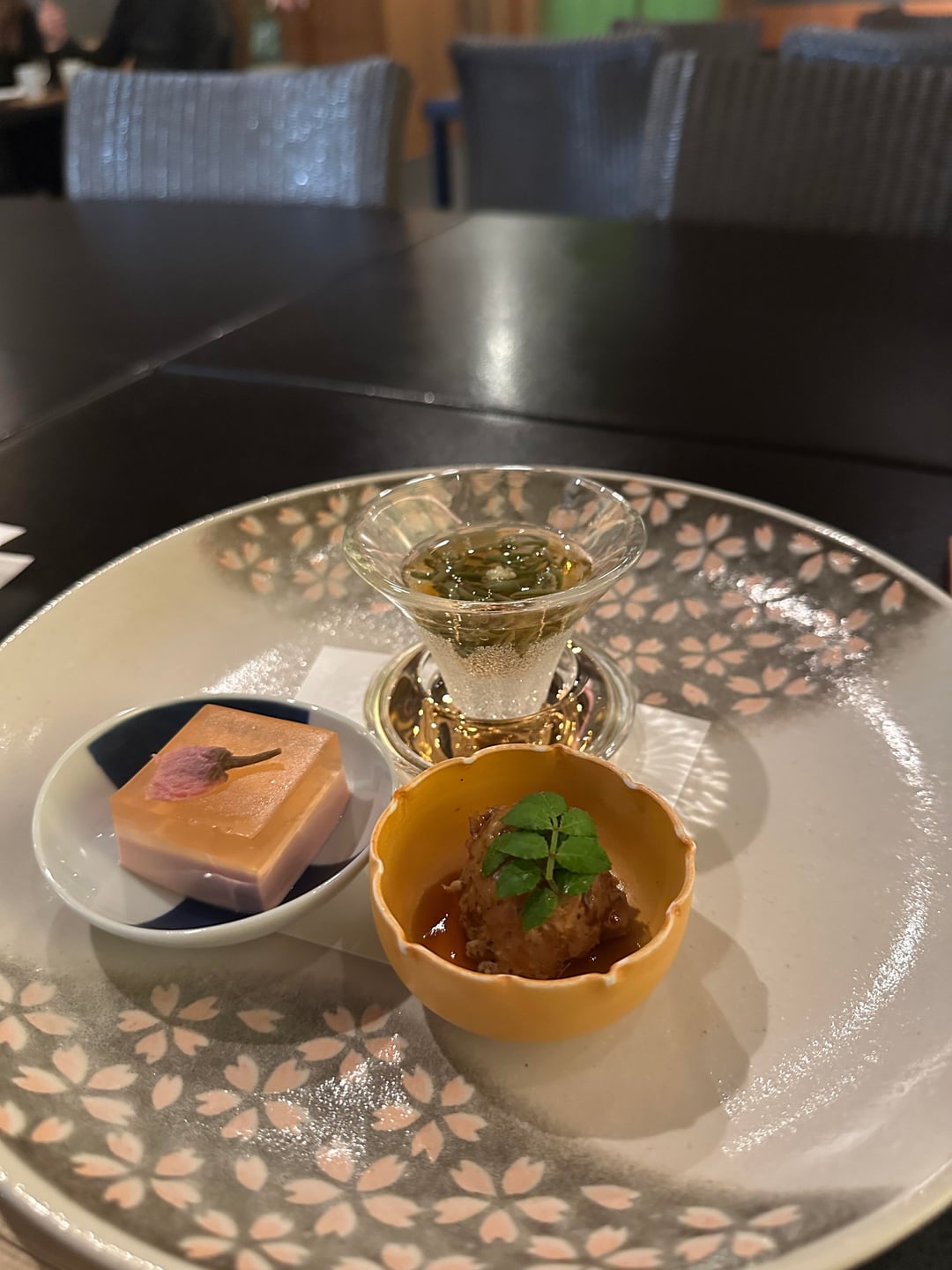 3. Three appetizers – junsai in vinegar with a touch of ginger, sakura tofu w gelee tasting of kombu dashi and tori tsukune (chicken meatball) also tasting lightly of ginger and kinome which added some great floral almost kaffir lime leaf flavours that I loved