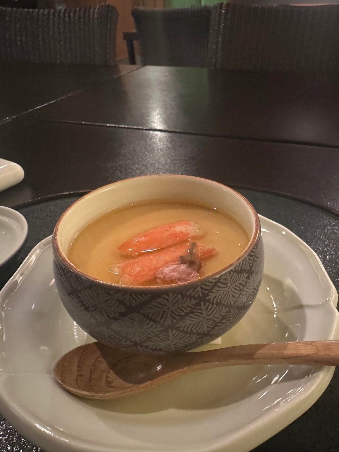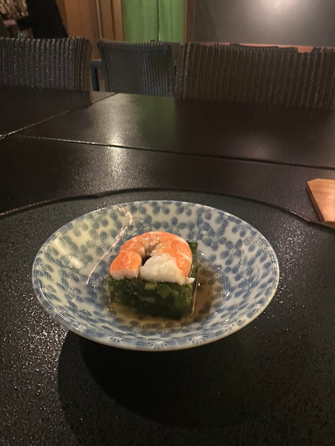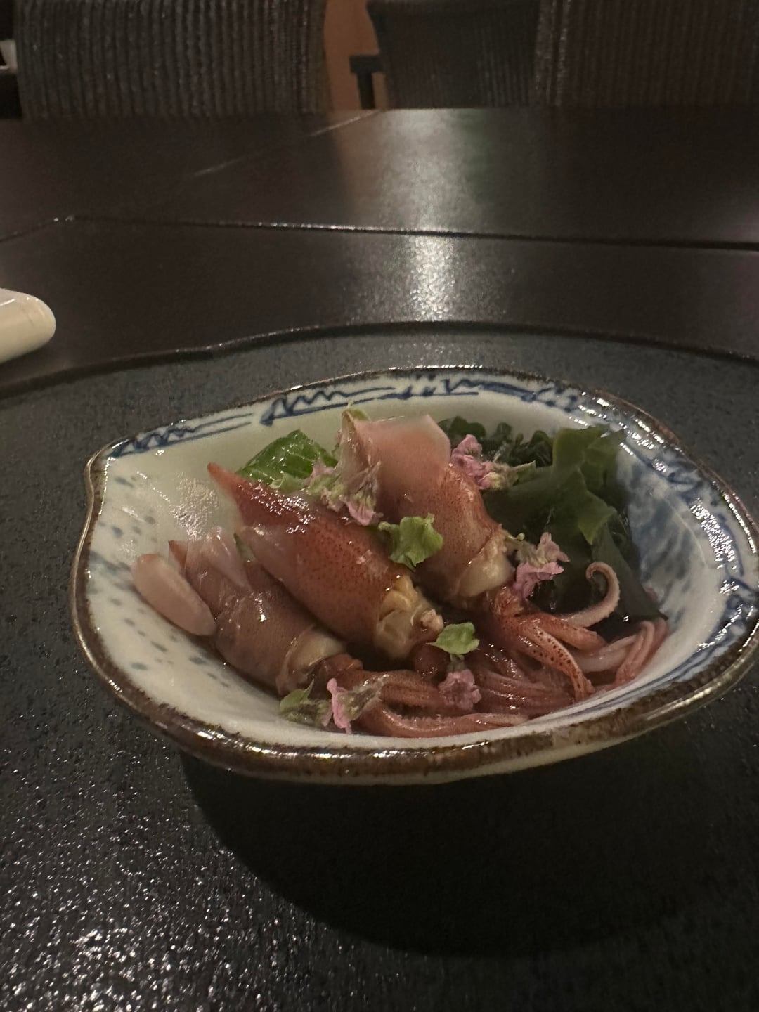 1. Nanoha jelly with shrimp and dashi – nice and strongly flavoured, a bit more than you could expect in Japan. Strong tasting dashi – very heavy katsuobushi taste coming through 2. Awabi – simmer with sake, mirin and dashi along. Sugar snap peas on the side 3. Three appetizers – junsai in vinegar with a touch of ginger, sakura tofu w gelee tasting of kombu dashi and tori tsukune (chicken meatball) also tasting lightly of ginger and kinome which added some great floral almost kaffir lime leaf flavours that I loved 4. Owan of bamboo shoots, wakame and kinome – really loved this. Strong tasting mixed dashi working marvelously with the kinome 5. Lightly seared sakura dai sashimi with myoga – really loved this, great texture and flavour 6. Ainame nimono- summed fat greenling/lingcod from Japan with wasabi on top. I don’t really like Japanese preps of (I like plenty of shiromi but ainame is notably bland and fatty which isn’t my favorite), This was fine – very meaty but just not my cup of tea. Simmering liquid is good, still that has that strong ass katsuobushi dashi 7. A5 Oita w salt and side of sweet potato – very nice, fat has render and edge piece was genuinely delicious 8. Kegani Chawanmushi – one of the better ones I’ve had in the bay. Good jiggle but not overly soupy with well cooked crab through out – nothing mealy or mushy. Very impressed by this 9. Grilled pounded lotus root with mentaiko inside. Got this instead of a fried agemono, would’ve been chi-ayu. Can’t eat a ton of carbs rn but this was really quite nice. Will make an exception for the agemono next time 10. Vinegar stewed hotaru ika with wakame and shisho flowers, tasty. Vinegar helps with the bitterness from the innards 11. Rice with sakura dai from his hagama + miso and pickles, I really enjoyed this rice and the simmered sakura dai that was mixed into it adding this nice sweet and savoury element on top of the rice. Pickles added some nice sourness and refreshed palate in between the largely portions of the rice 12. Sakura mochi, forgot to take a photo but it was pretty good