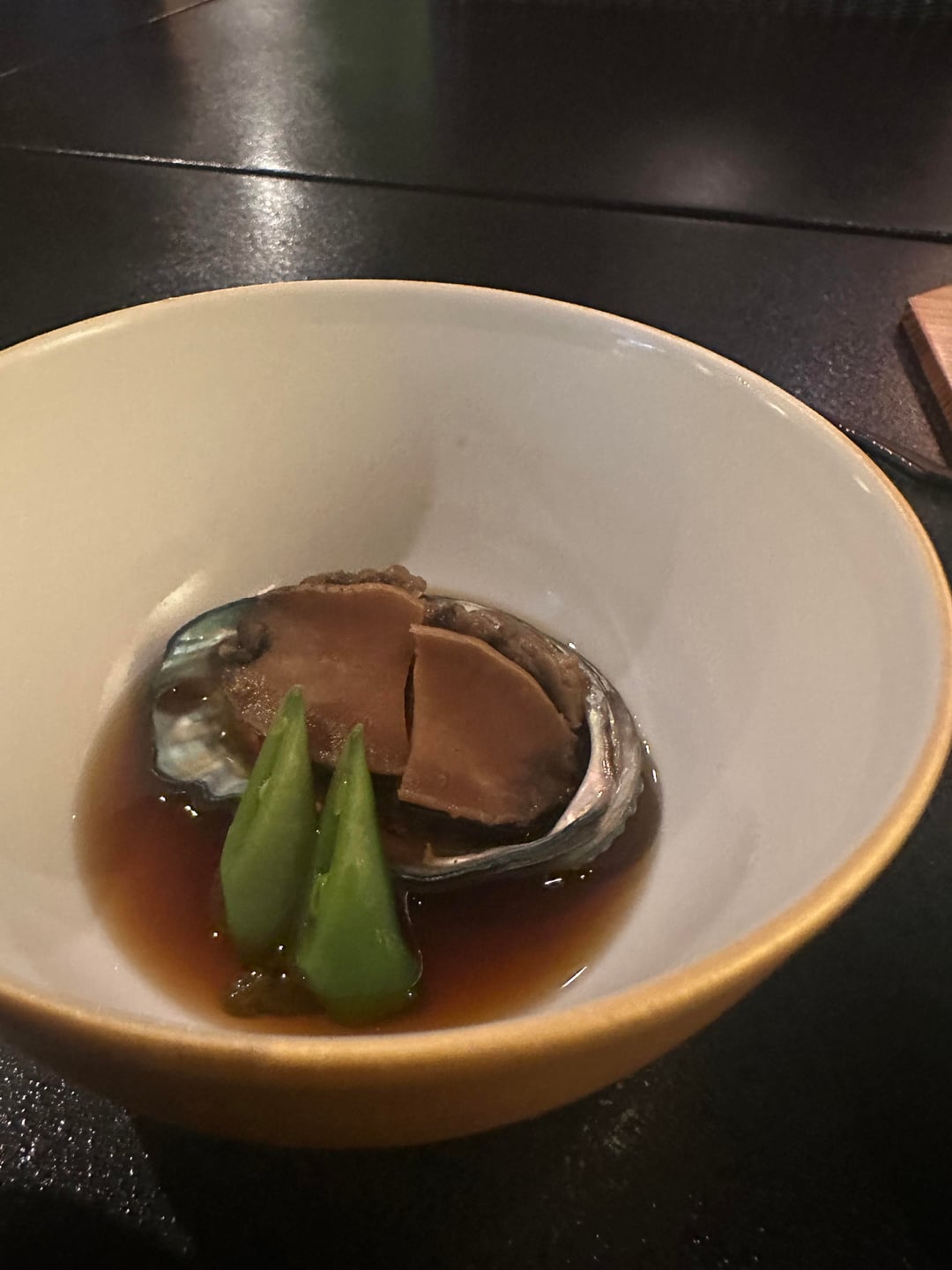 2. Awabi – simmer with sake, mirin and dashi along. Sugar snap peas on the side