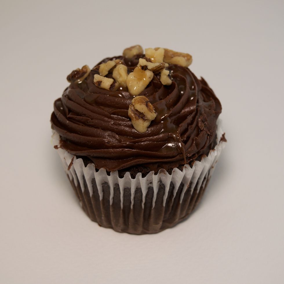 Another Cupcake Wars winner, this one is sure to be a treat! This chocolate-walnut cupcake is injected with a smooth caramel and topped with a rich chocolate buttercream, chopped walnuts and a caramel drizzle!