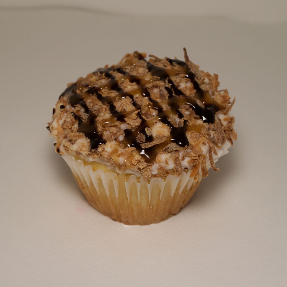 Just like the Girl Scout, this cupcake is a hit! A white cake topped with a sweet vanilla buttercream, rolled in toasted coconut and drizzled with chocolate and caramel!