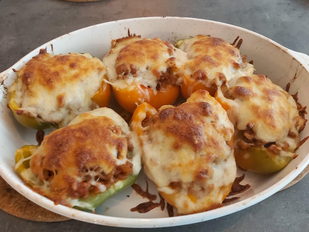 3 bell peppers 500 grams minced meat 1 onion 1 tomato 1 can of tomato puree (70 gams) 2 cloves of garlic Grated cheese, I used mozzarella Seasoning: peppercorn, paprikapowder