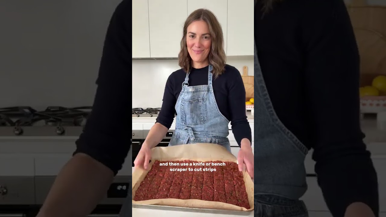 Shape onto tray – Line a large baking tray (or two smaller trays) with baking (parchment) paper. Press the mince mixture on the tray into a large rectangle about 1 cm (½ inch) thick – roughly 30 x 40 cm (12 x 16 inches). Keep the edges relatively tidy but don’t stress about perfection.