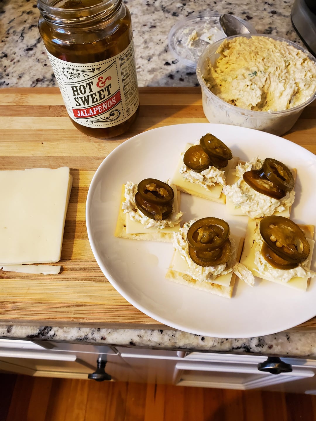 Chicken salad on saltines with white American cheese topped with candied pickled jalapenos.
