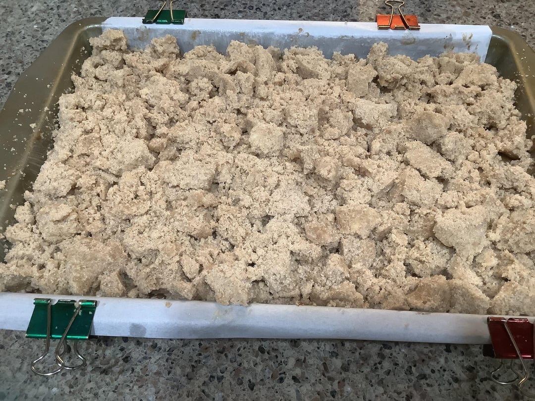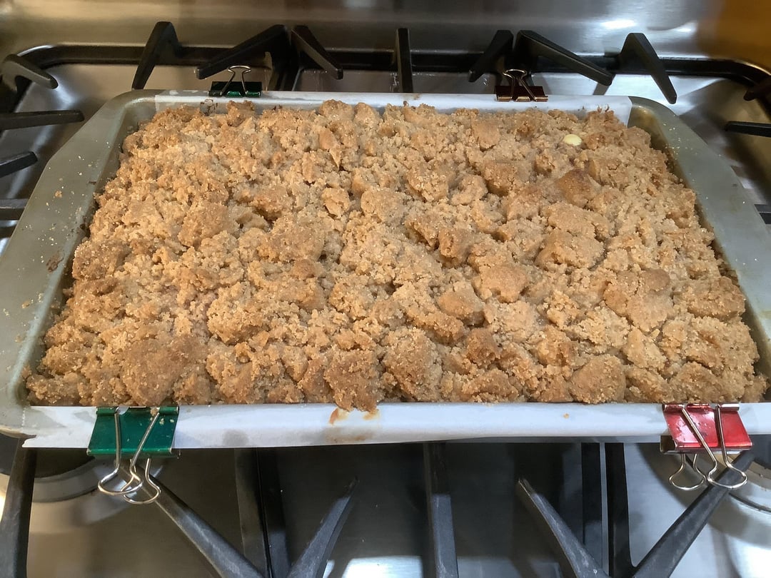 To make the crumbs, in a mixing bowl stir to combine then refrigerate until needed: 2 ¼ cups (used 305 grams) flour, 1 ½ cups (300 grams) granulated sugar, 1/3 cup (used 100 grams) dark brown sugar, 2 teaspoons baking powder, and 4 teaspoons cinnamon