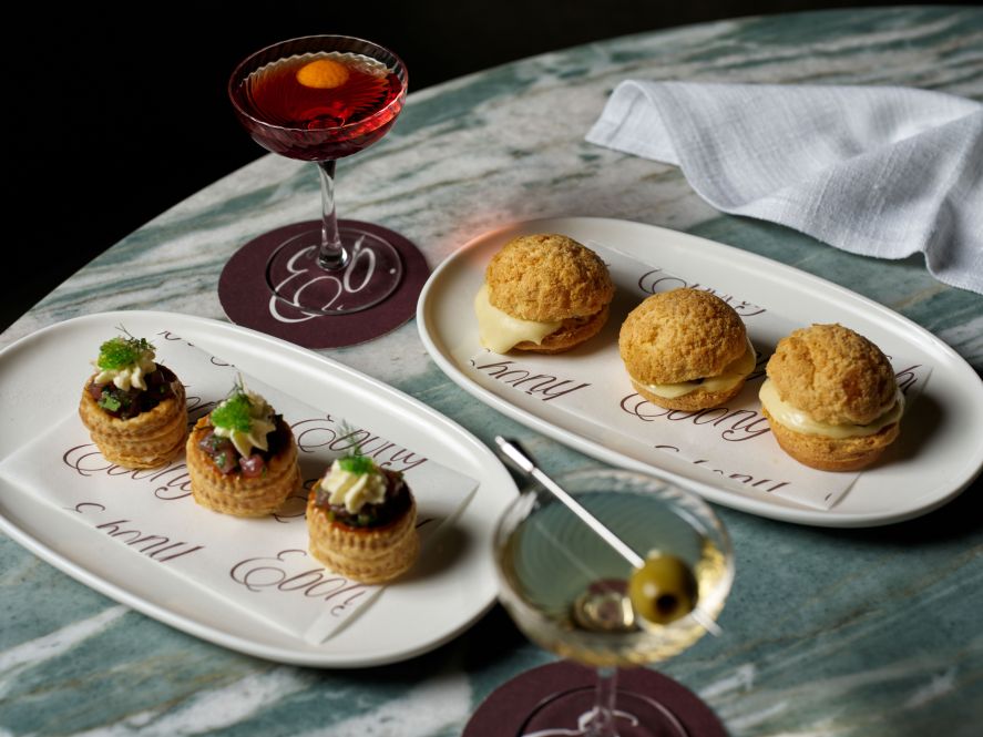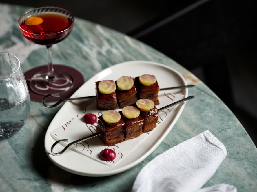 Snacks on the menu include parmesan-crusted bite-sized choux buns filled with comté custard and confit shiitake ($12); bluefin tuna vol-au-vent with horseradish cream, tuna tartare mixed with shallots, chives, and capers; tempura zucchini blossom stuffed with spanner crab and mascarpone ($17); and confit lamb belly skewers with rosemary jus and pickled golden beetroot ($14).