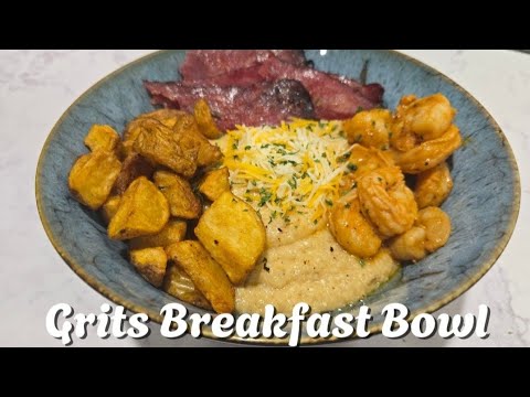 This Shrimp & Grits Bowl is the ultimate comfort breakfast, creamy grits layered with oven baked turkey bacon, seasoned shrimp, and crispy fried potatoes. Every bite hits different!