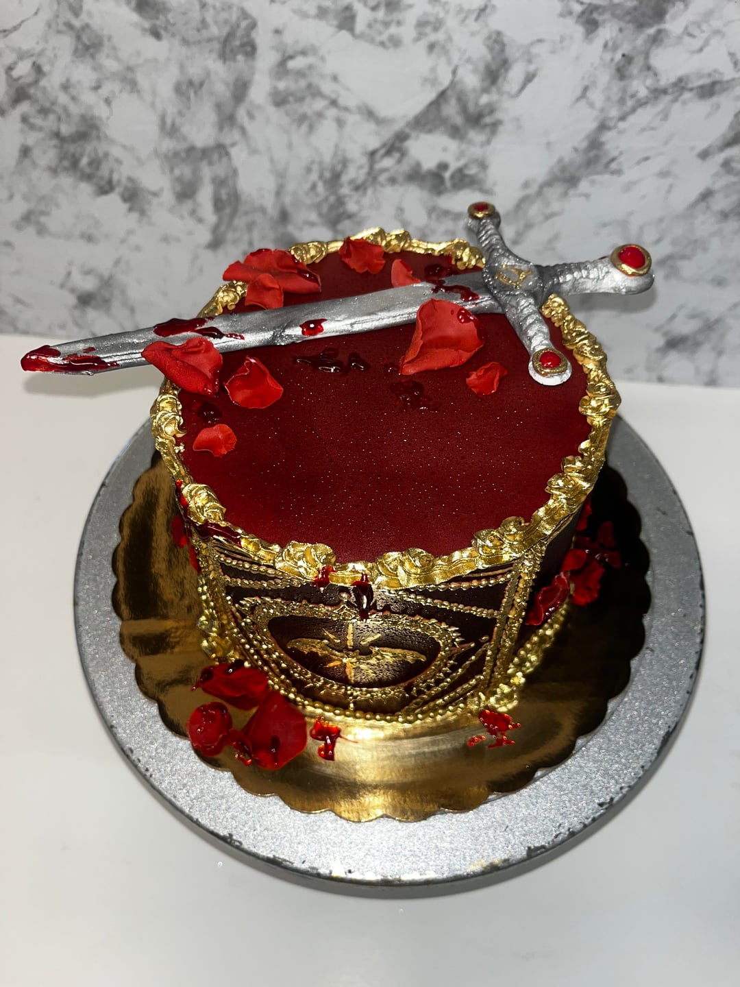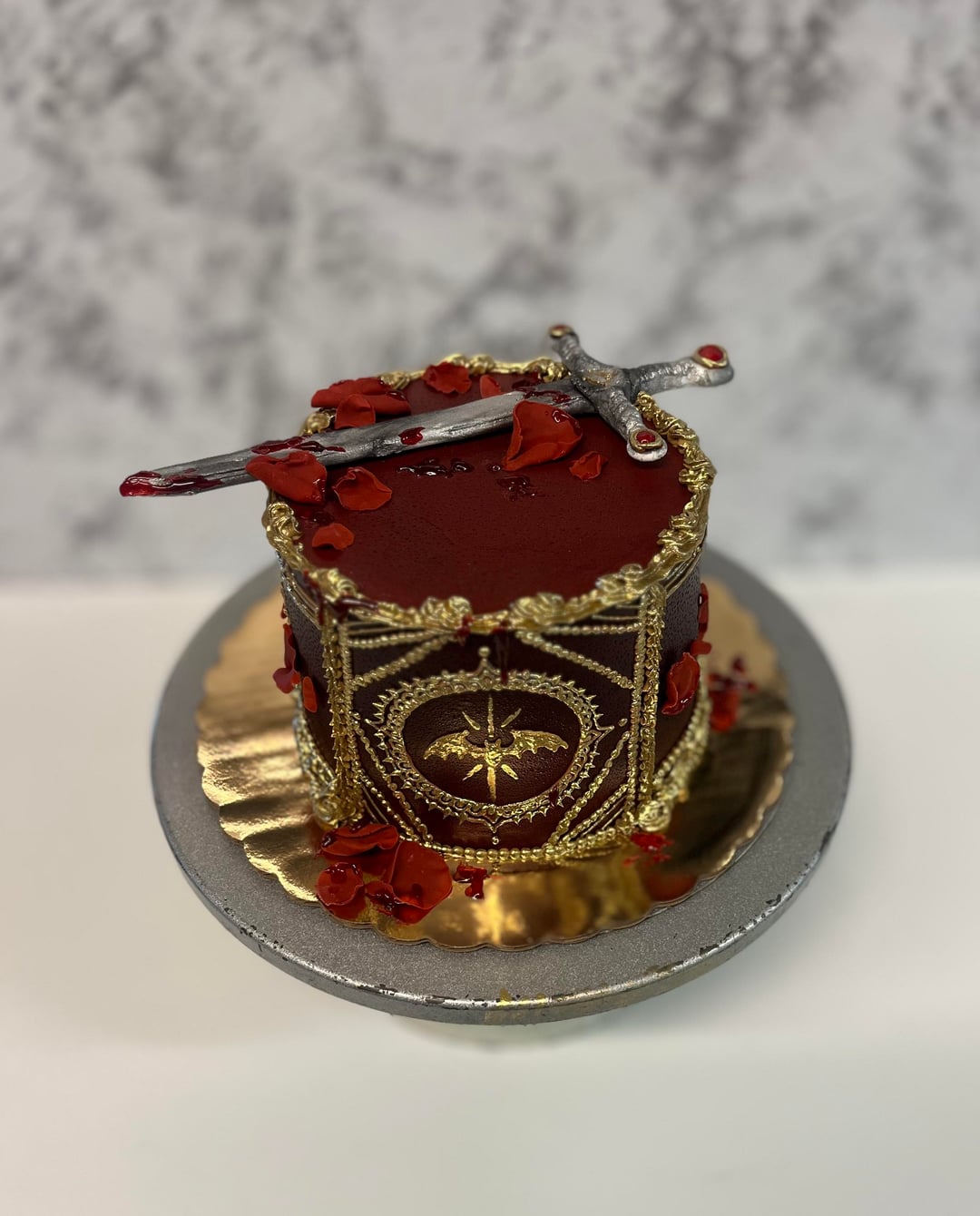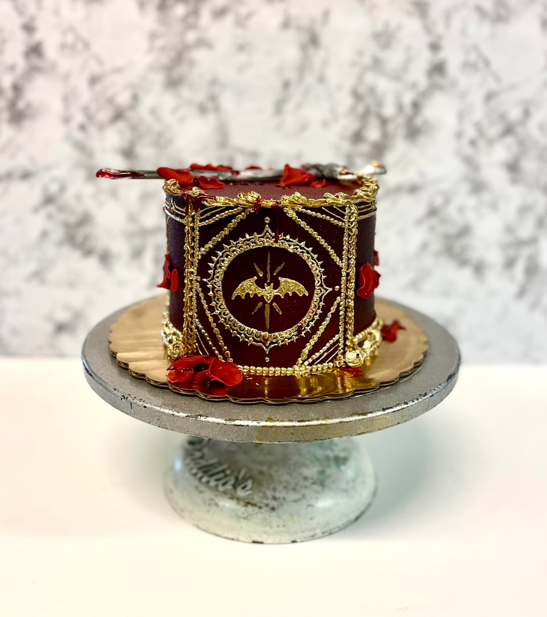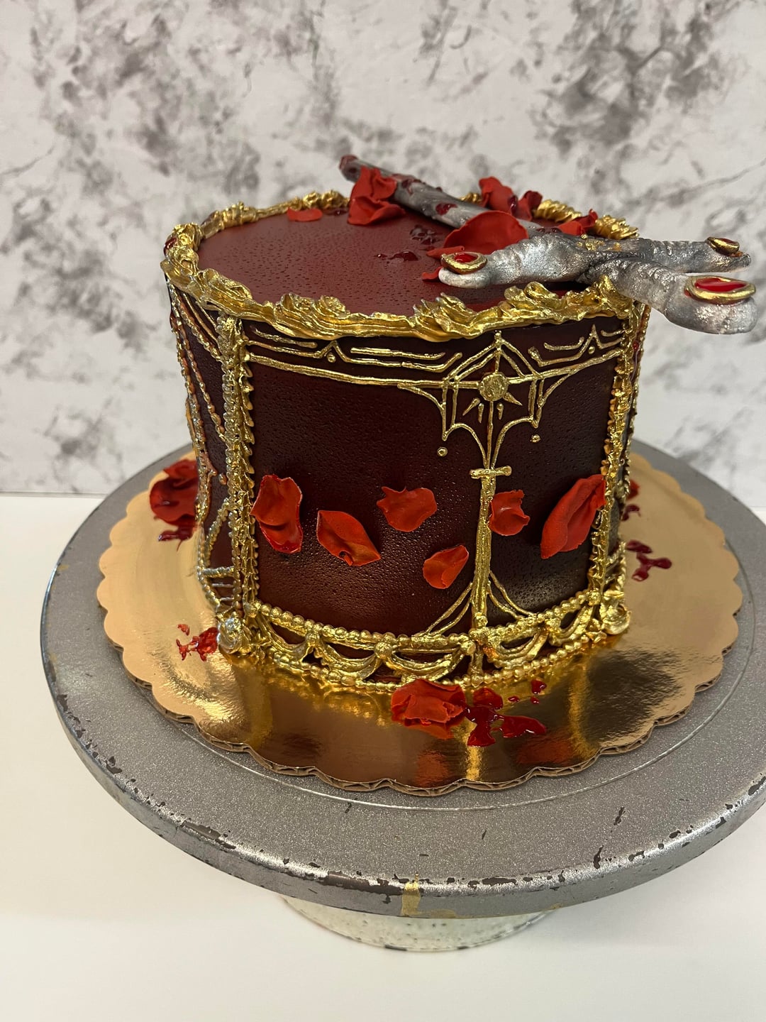 This one is for my vampire lovers! Where y’all at? Vampires are my favorite mythological creature so whenever I get the chance to do something around that aesthetic, I go a little crazy. This one is probably my favorite cake I’ve done in a long time. The dagger and rose petals are fondant, everything else is piped and brushed with edible gold luster dust. The cake is dark chocolate with a fresh raspberry puree filling. Something tasty to sink your fangs into! Hope y’all enjoy this design!