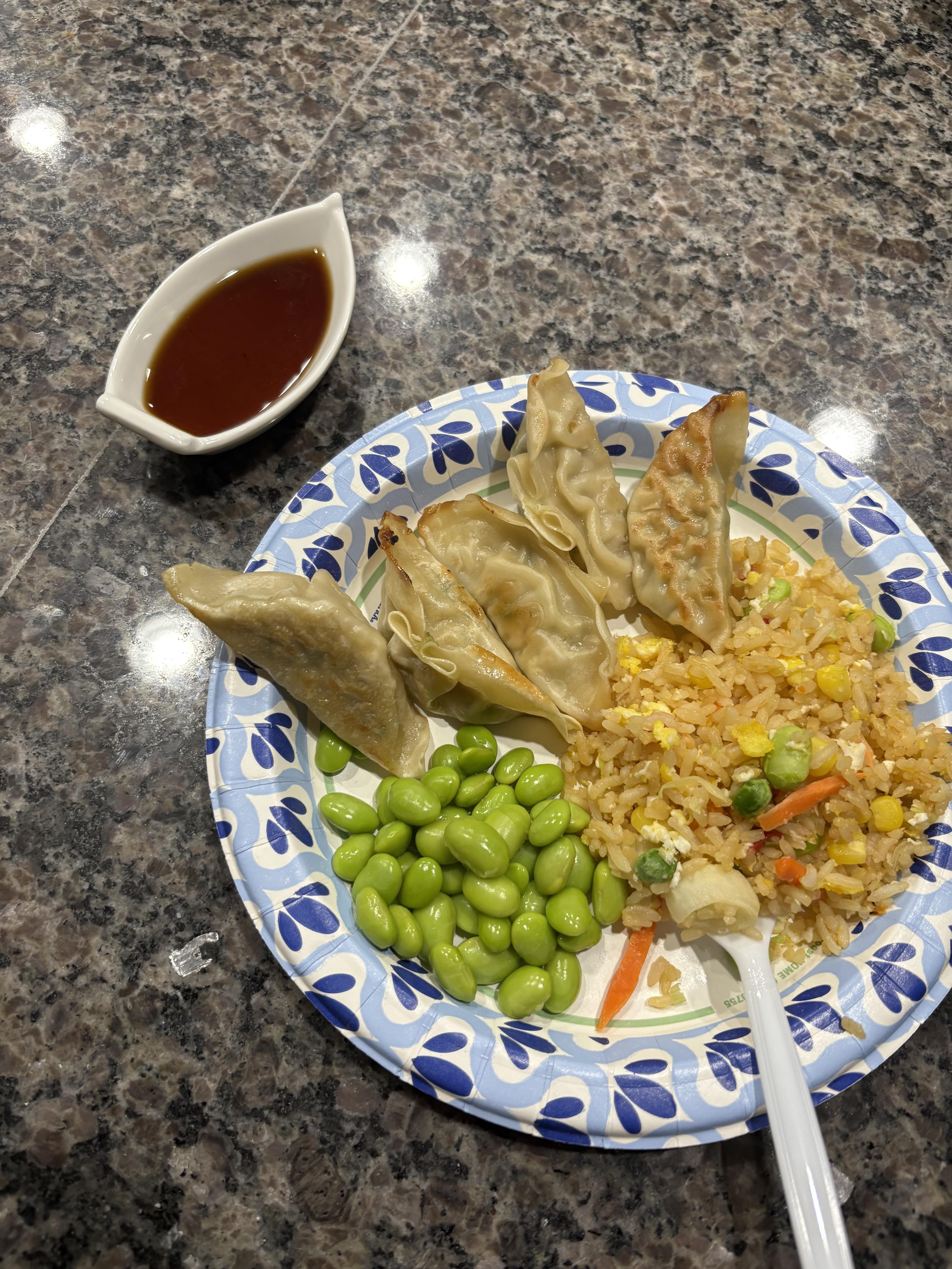 Dumplings are bibigo chicken & veggie…serving size is 7 for 220cal but 5 are usually just right. I use 1/2 serving of kikkoman gyoza sauce for dipping.